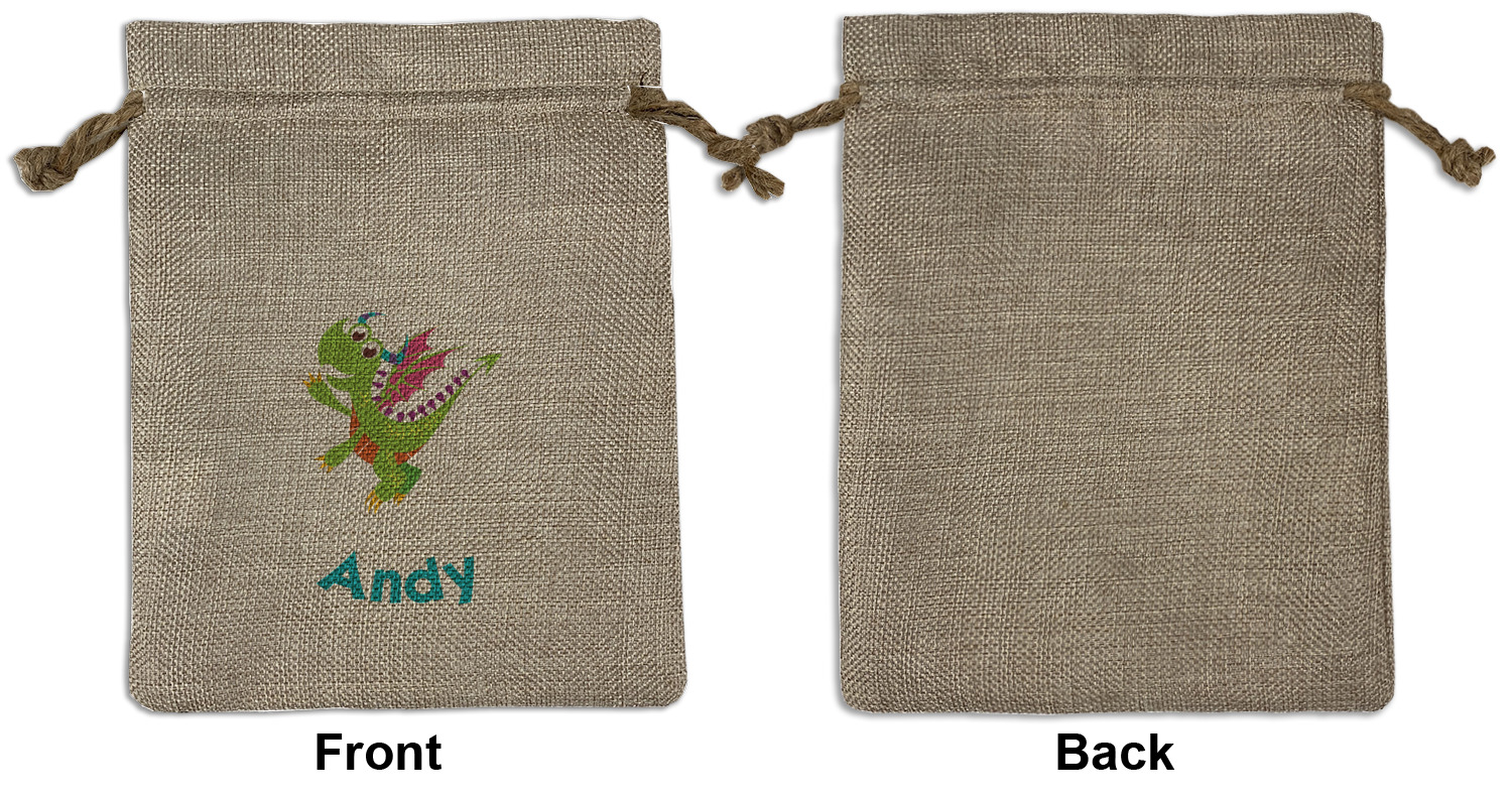 We sell our Burlap Gift Bags in 3 variant sized bags. Made with burlap polyester, each personalized bag can be secured with a twine drawstring pull. Your custom design is available to print on one side or both sides - completely up to you! The sizes of the bags measure approximately 4.5" x 6.5" for the smallest size, 6.5" x 8.0" for the medium size, and 6.5" x 13.5" for the large-sized bag.