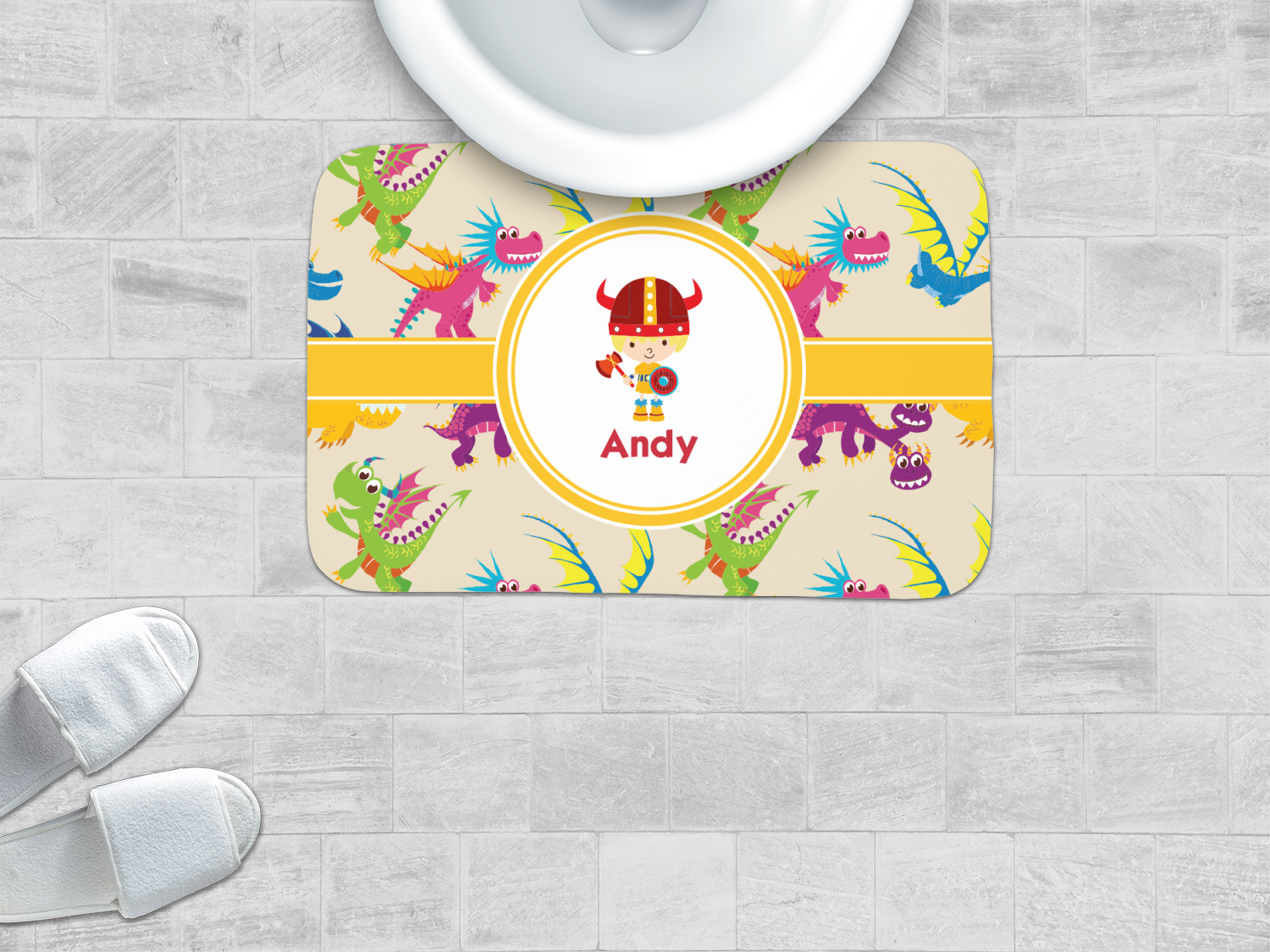 A white outlined yellow band with a yellow circle label highlights the little dragon slayer. Change the hair color to match your little guy and add his name to make this a fun design for all dragon lovers.