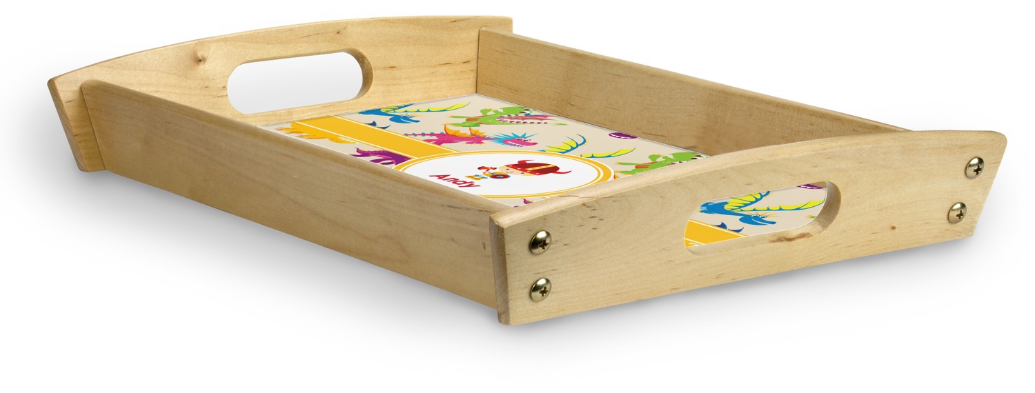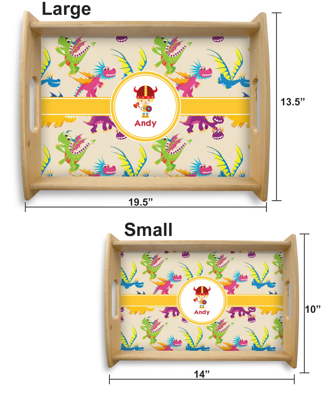 This serving tray with handles features square edges and two rounded sides, creating a very modern look. Each side is fabricated from a beautifully cut, natural wood. The bottom of the interior of the tray displays your customized design in bright, vibrant color. The tray is sold in both a black color and a natural wood look. Each variation of the wood serving tray has two sizes: Small, which is 14" x 10" x 2.25", and Large, which is 19.5" x 13.5" x 2.75".