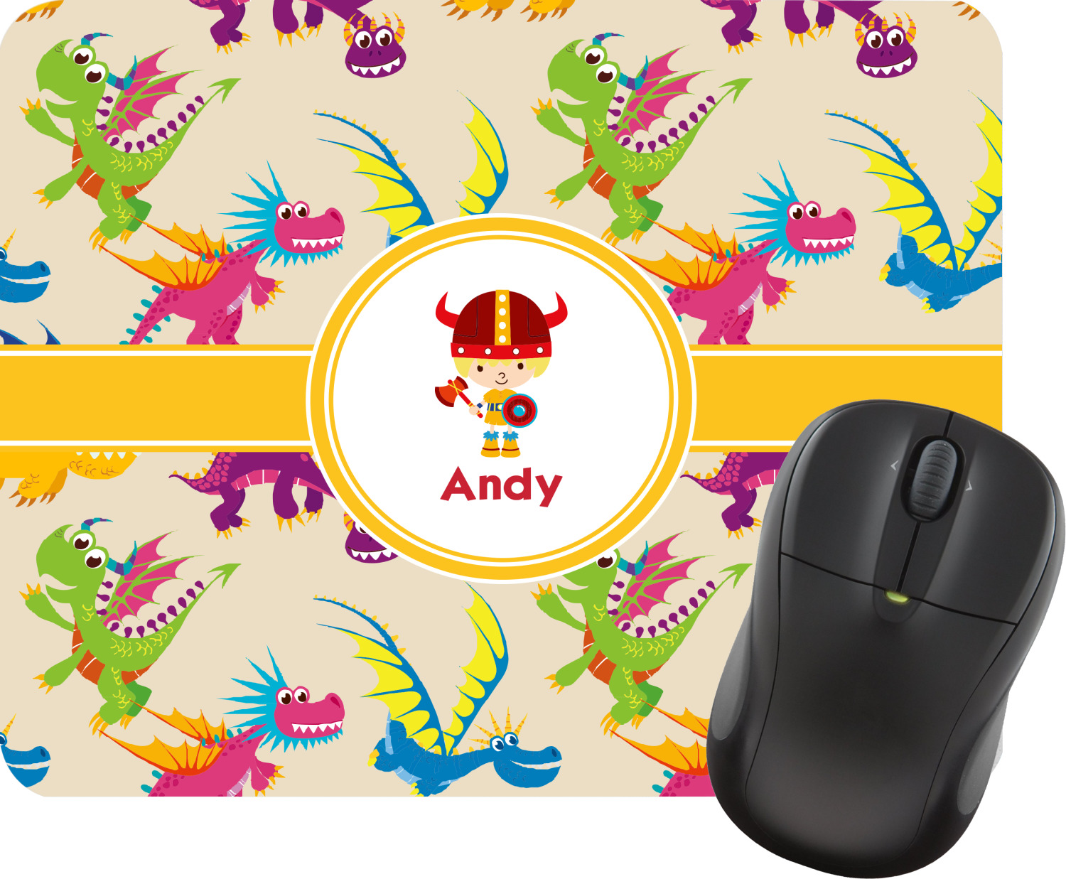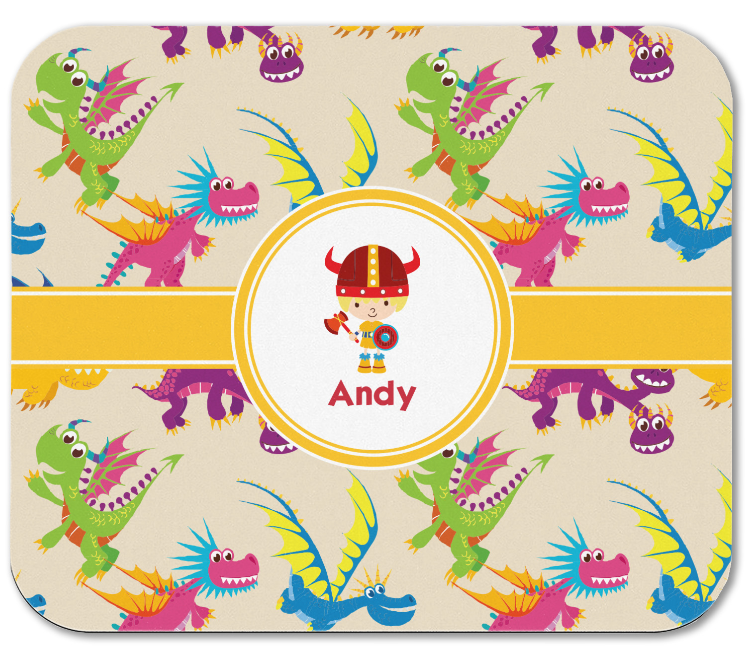 A white outlined yellow band with a yellow circle label highlights the little dragon slayer. Change the hair color to match your little guy and add his name to make this a fun design for all dragon lovers.