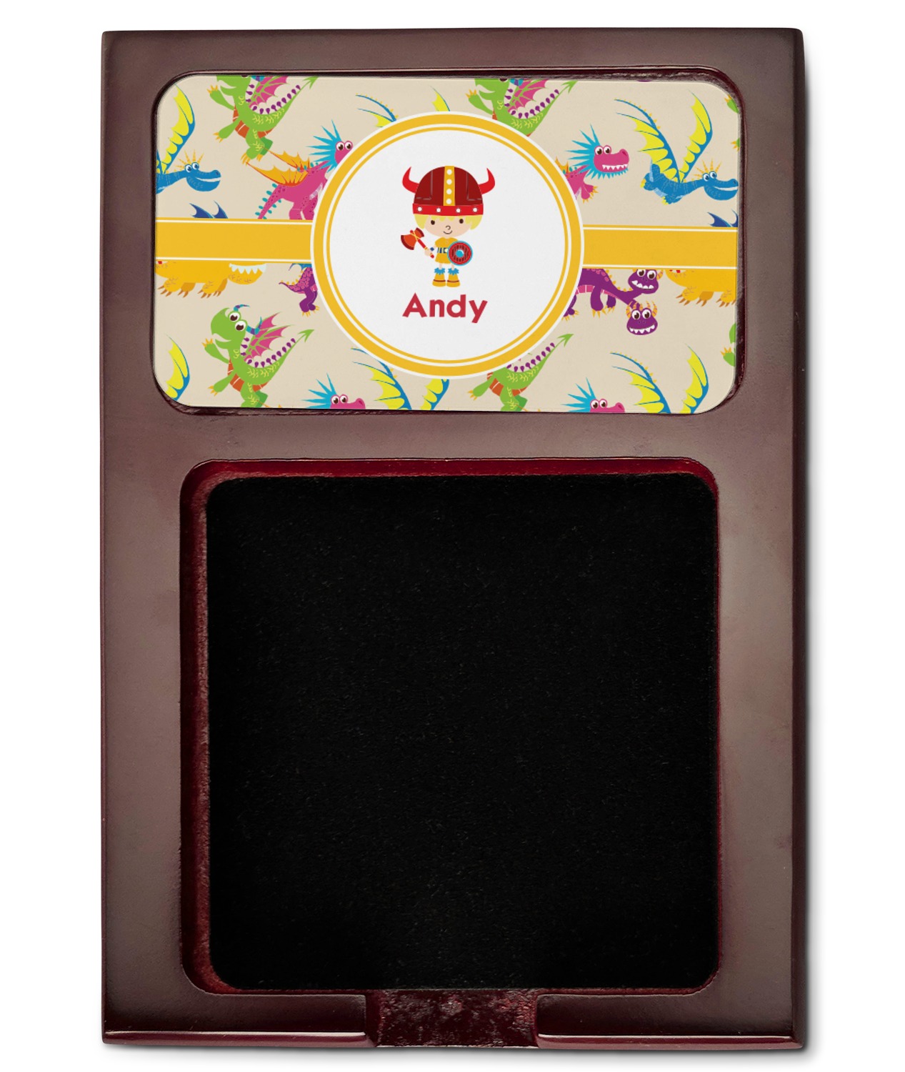 Crafted from a fine mahogany, this post it note holder is in the shade of a dark, cherry color. The dispenser itself is about 4.25 by 6.25 by 0.75 inches. You can place your 3 by 3 inch sticky notes in the indentation below the nameplate. We print your customization onto the nameplate that rests above the velvety indentation.