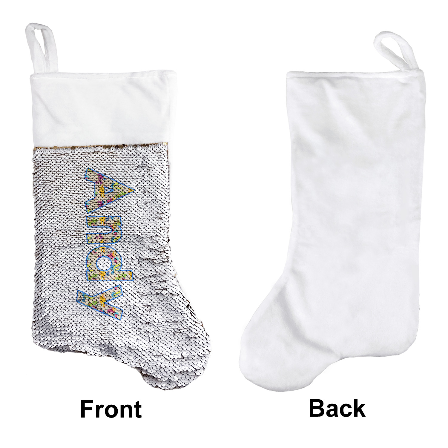 Our fun sequin stockings are made from a soft, yet durable polyester material perfect for any stocking stuffer or holiday decor! Choose from a glamorous gold stocking or classic red sequin stocking for the front color and have your personalized image printed behind for reversible fun! Our sparkly sequin stockings are super fun and decorative perfect for the family and you this holiday! Each stocking is approximately 17" x 9" with a durable loop for hanging and printed here in the US.