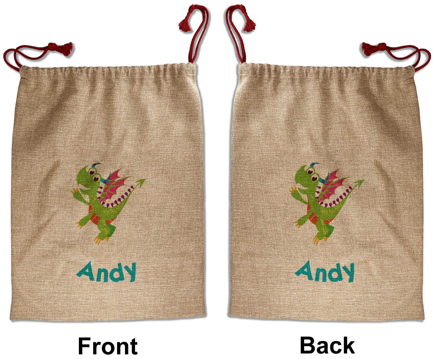 Our Santa sacks print your design on the burlap material giving it a nice rustic, natural design! The burlap material is also machine washable and wrinkle-free, so feel free to fold and store out Santa bags until the next time you need it! Secure your gifts with our red accent drawstring ties at the top of the sack so the mystery of your gift stays a surprise until Christmas day. We offer two types of printing- one side partial print or double-sided partial printing. Design and personalize your own Santa sack in time for the holidays!