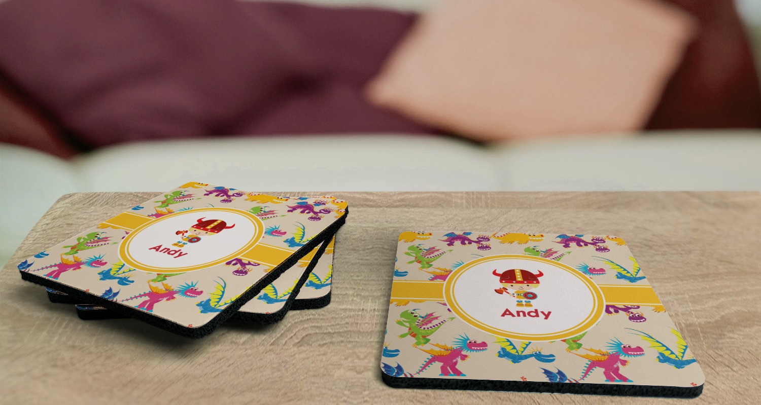 These drink coasters have a smooth, polyester top and a textured, rubber backing on its bottom. The non-slip rubber backing underneath works to keep any spills at bay. At 4 by 4 by 0.25 inches thick, these custom coasters are a suitable size for most drinkware. Your personalization is displayed atop the face of the cup coaster. We sell these rubber coasters in two different shapes: square and round. You can buy each shape as singulars or as a set of 4.