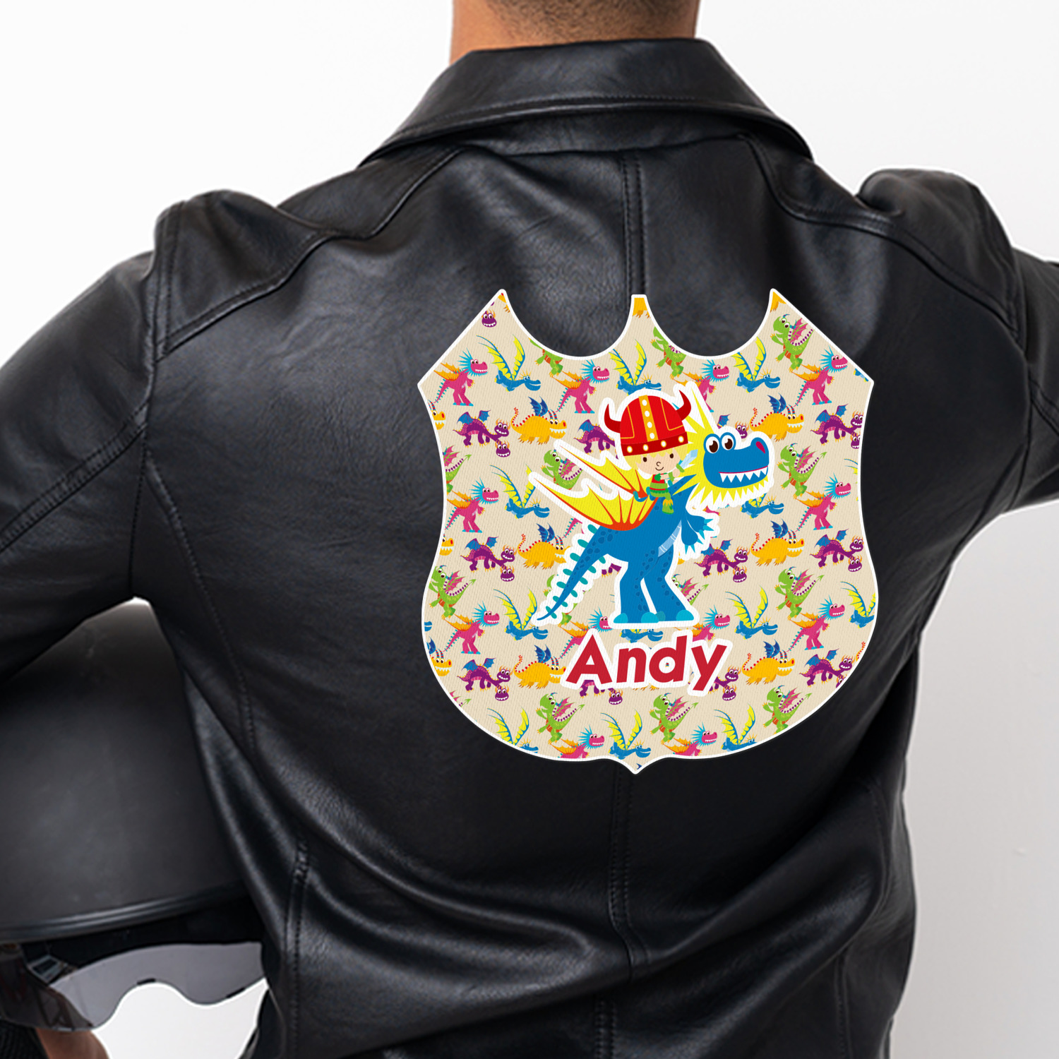 A white outlined yellow band with a yellow circle label highlights the little dragon slayer. Change the hair color to match your little guy and add his name to make this a fun design for all dragon lovers.
