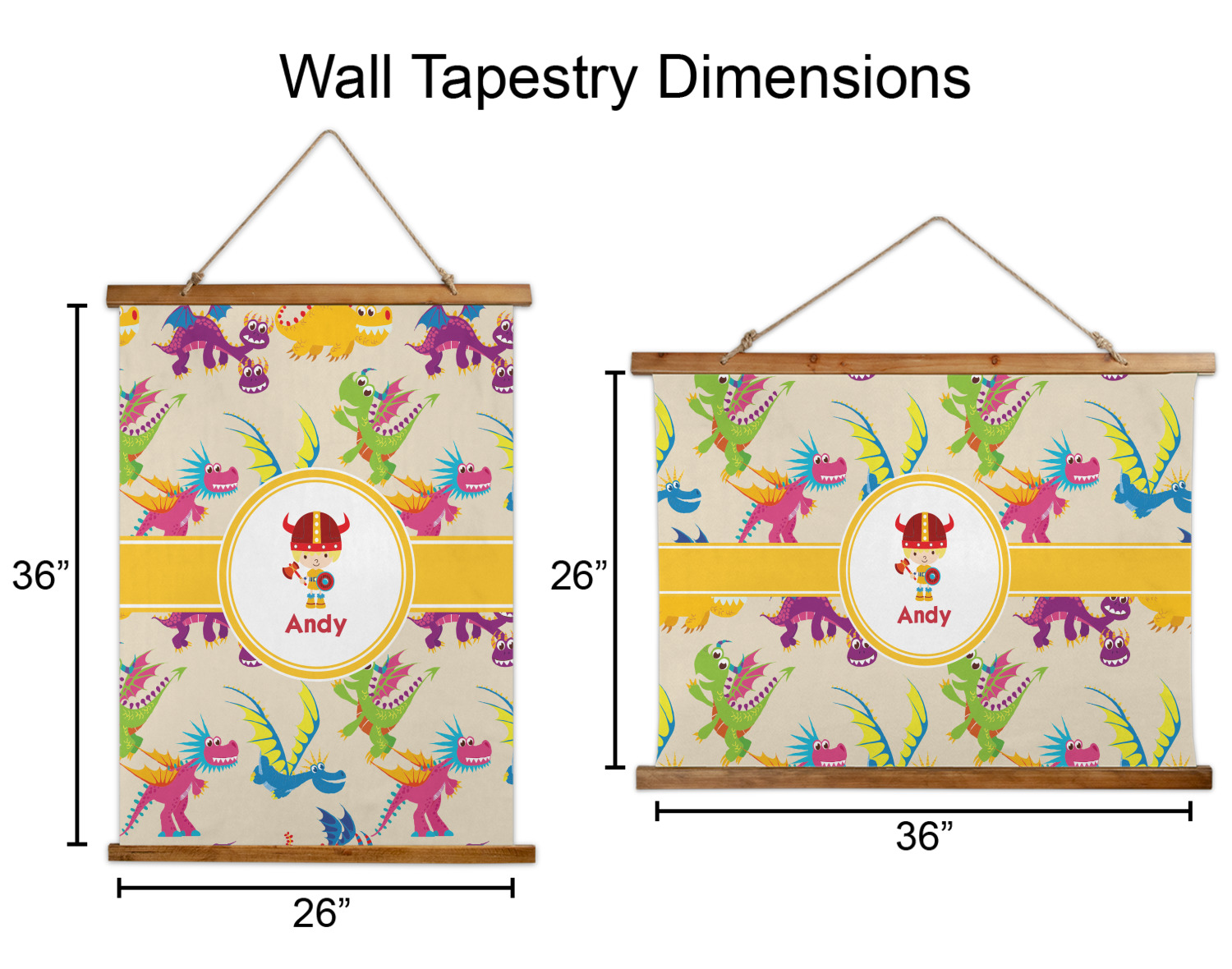 Made in two different orientations - portrait or landscape - both are 26" x 36". Your design is printed on a high quality polyester fabric with hemmed edges. The wood on the top and bottom of the tapestry is 1.25" tall and 0.25" thick and there are two pieces on top and bottom which sandwich the fabric.