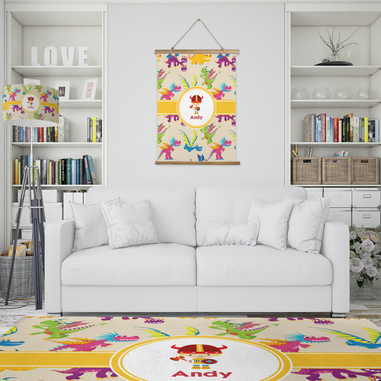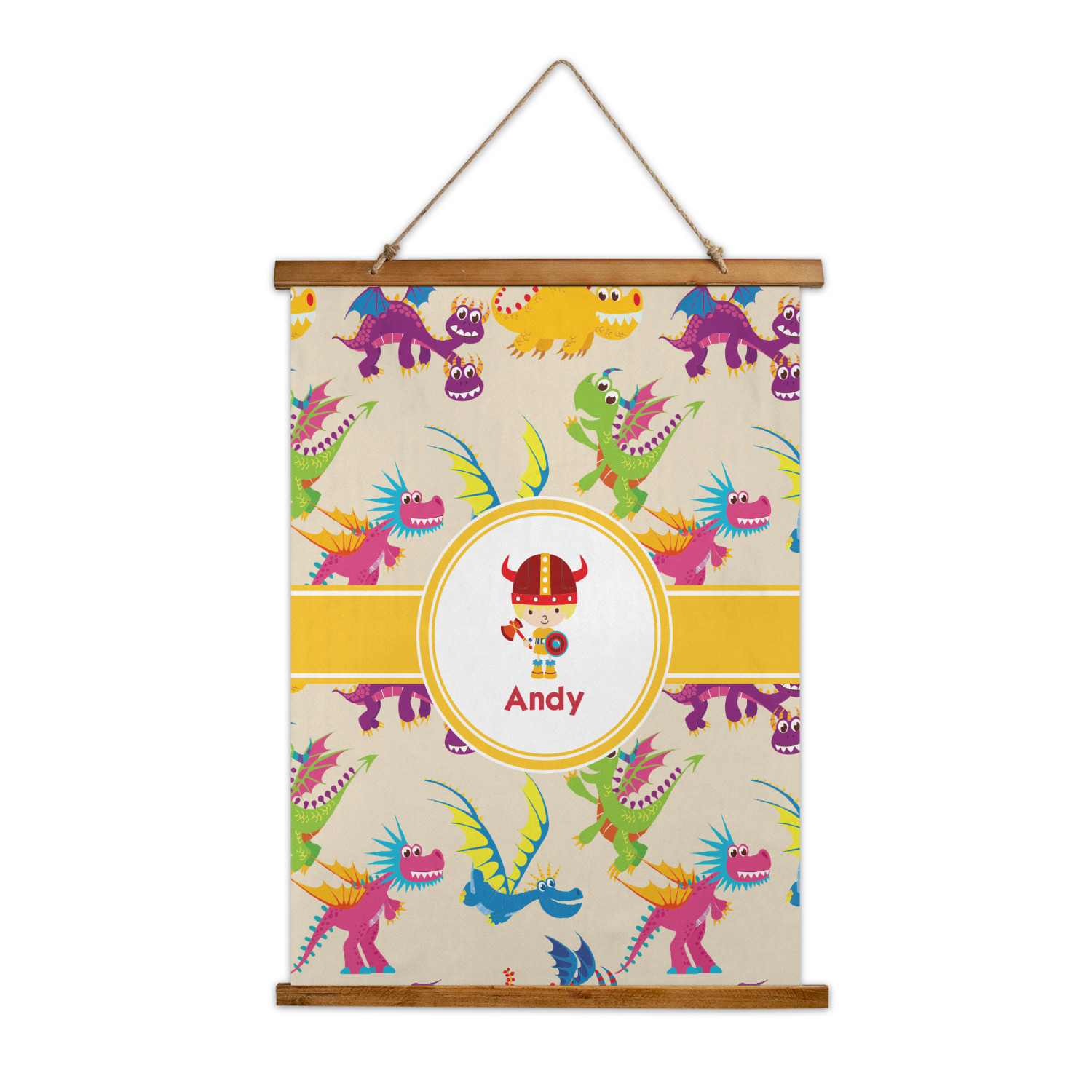 A white outlined yellow band with a yellow circle label highlights the little dragon slayer. Change the hair color to match your little guy and add his name to make this a fun design for all dragon lovers.