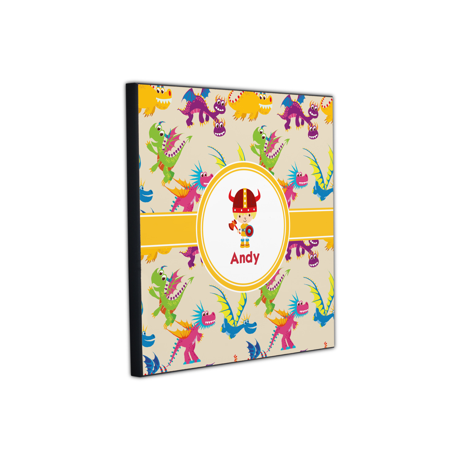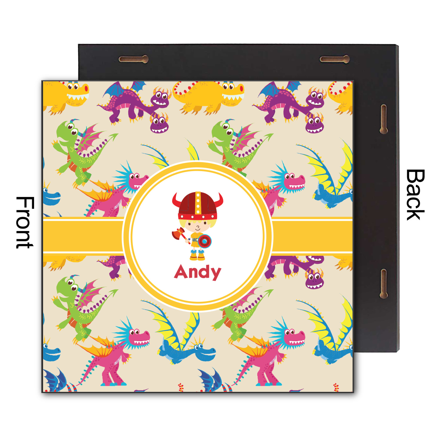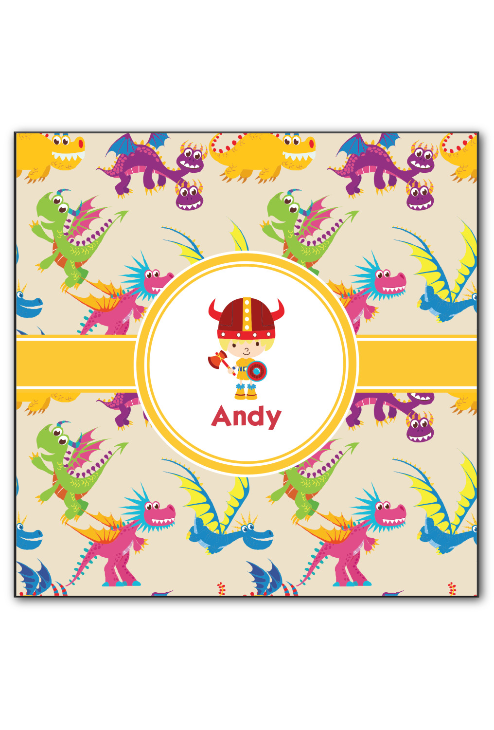 A white outlined yellow band with a yellow circle label highlights the little dragon slayer. Change the hair color to match your little guy and add his name to make this a fun design for all dragon lovers.