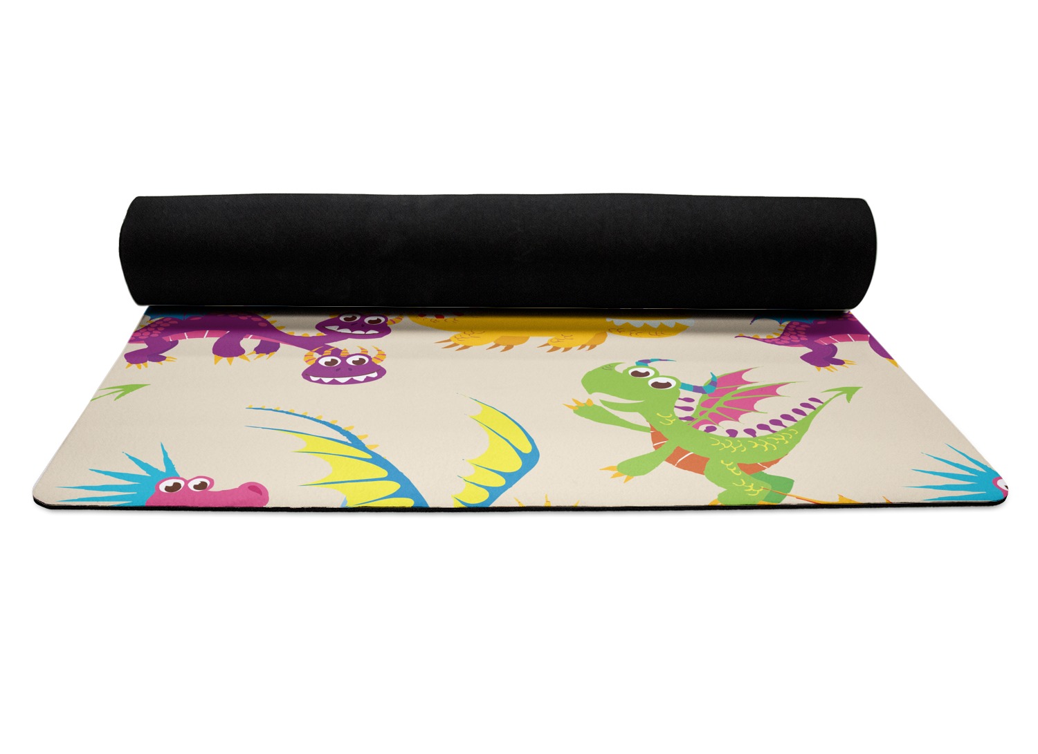The top of the mats are dyed with your design using eco friendly non solvent inks. They have a smooth fleece felt top and feels very soft. The back of the mat is a sleek black and is a squishy non-slip texture to ensure that your mat does not slip on the floor. Our rubber backed mats are the perfect size at 68" x 24" and are just under approximately 1/4 inch thickness.