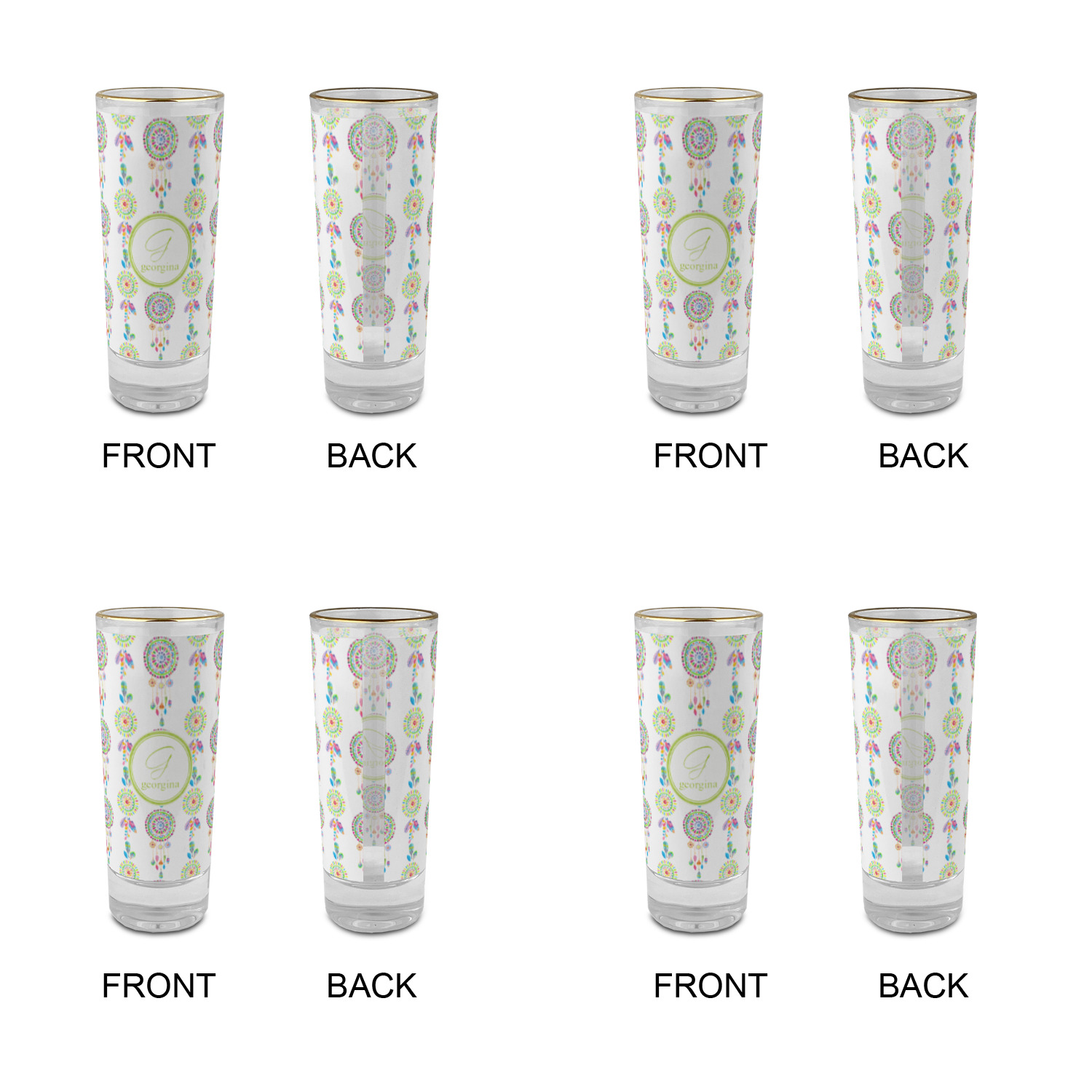 These glass shooter glasses are printed in full color with the design of your choice. These are a tall shooter 2 oz size and stand 4" tall. The print is a full wrap design to boldly display your personalization.
