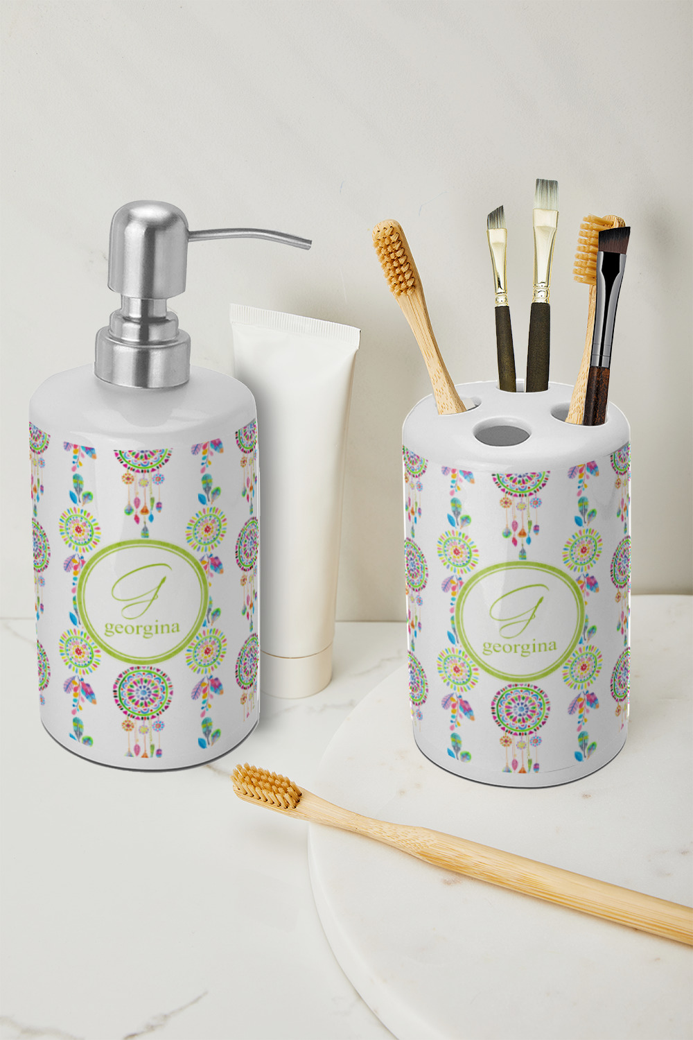 Both pieces of the set are made of white ceramic with a glossy finish. The dispenser has a brushed stainless nozzle and plastic pumping mechanism. The top easily screws off and on to refill. The toothbrush holder is one solid piece with four holes on top and one hole on the base. The top four holes measure 3/4 inch in diameter, and the hole at the base is 1 inch in diameter. The design does NOT wrap all the way around. There is about a one inch white stripe on the back of both items.