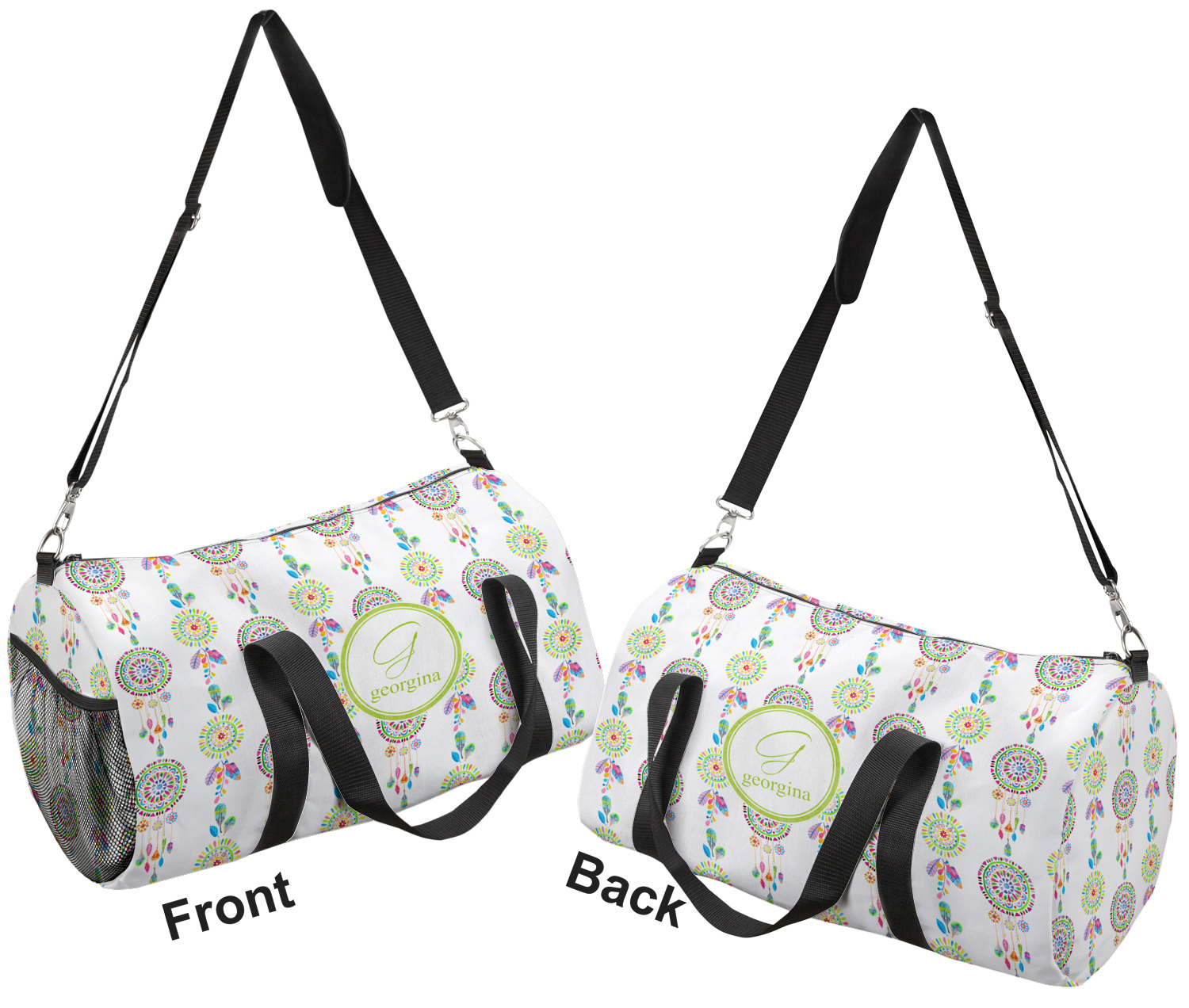 This duffle is a sturdy bag made of a canvas material. It comes in two sizes: Small (19"W x 9.5"H x 9.5"D) and Large (23"W x 12"H x 12"D). The bag is a cylindrical shape with a black adjustable strap and two handles. On one side is an elastic pouch to put a waterbottle or other small item. Your product will be sublimated with your design and is able to be designed on the front, back, and sides. Be sure to remember that the straps may cut into parts of your design if you upload your own artwork.