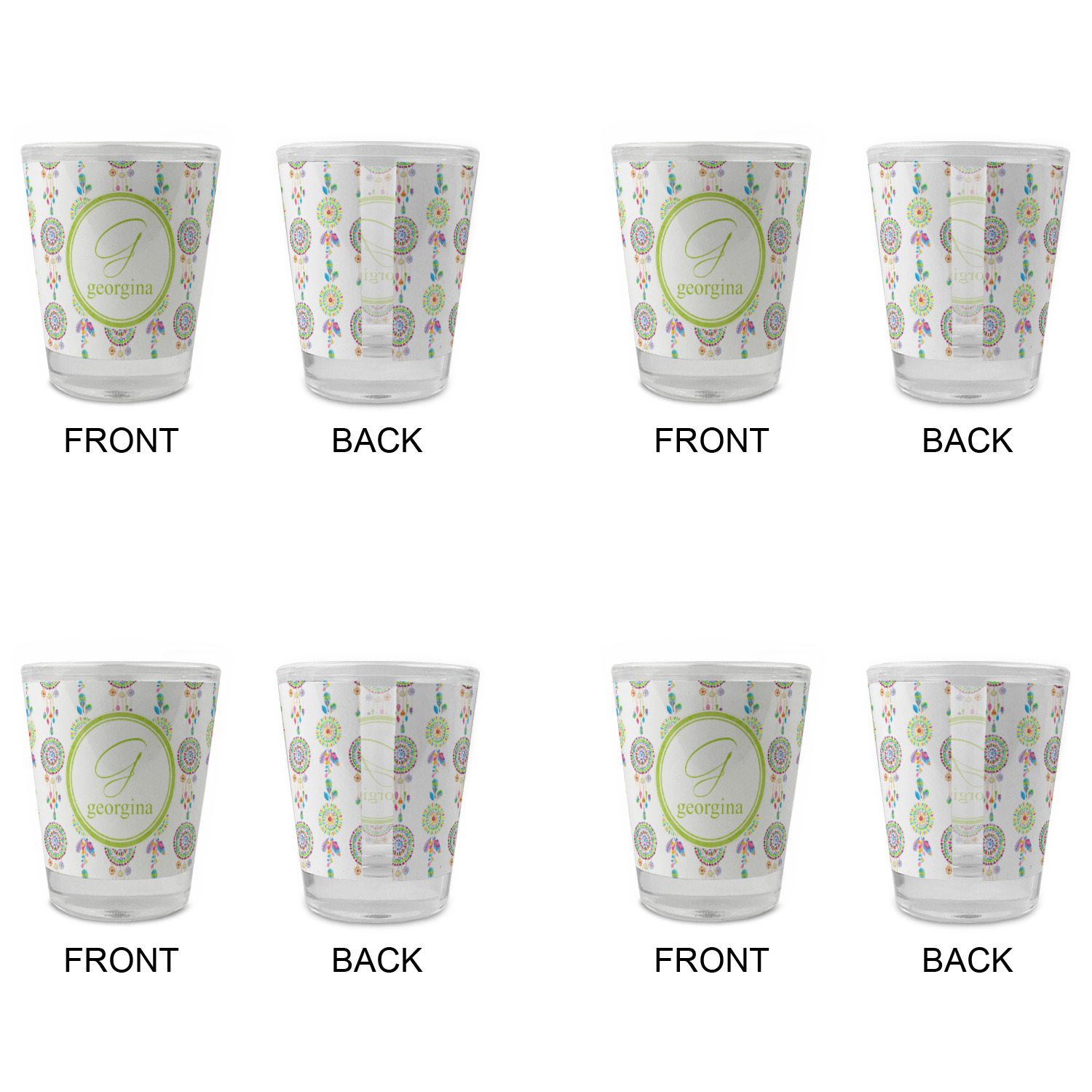 Made with frosted glass, these shot glasses are printed in full color with the design of your choice. They are a standard 1.5oz shot glass and are 2.4" tall. The print is wrapped around the shot glass in a full wrap and boldly displays your customization.