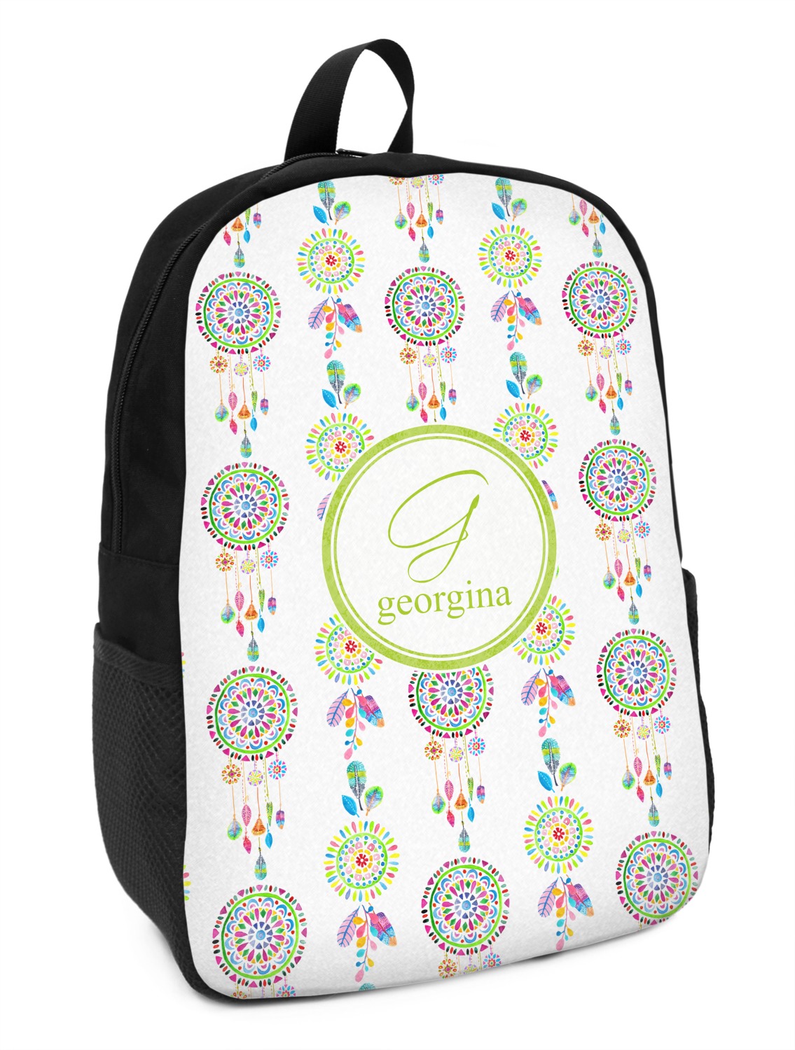 These small backpacks are made of a durable black canvas material with your personalization right on the front. The two shoulder straps are padded and easily adjustable. The bag itself measures at about 11" W x 15" H x 5" D. It's the perfect size for elementary aged kids or adults who want a smaller backpack. On the top of the bag you will find a handle to hang or carry your backpack by as well as a large zipper closure to keep all of your belongings safe inside. On each side of your backpack is a mesh pocket for a small item or water bottle. Inside your backpack you will find a spacious area with a small zipper pocket and a padded laptop slot that will fit up to a 13" laptop (13" being very snug). This is the perfect bag for any student that needs a couple books and their laptop with them at all times. It also works great as a carry on for traveling!