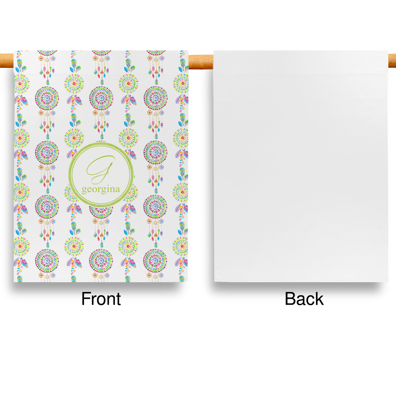 These custom garden flags are made of a durable, double-ply, polyester weave, allowing them to withstand the elements year round. The small flags measure at approximately 12 by 18 inches. The large flags measure out to 28 by 37 inches. You can order these decorative flags with your customization printed on the front only, or the front and back.