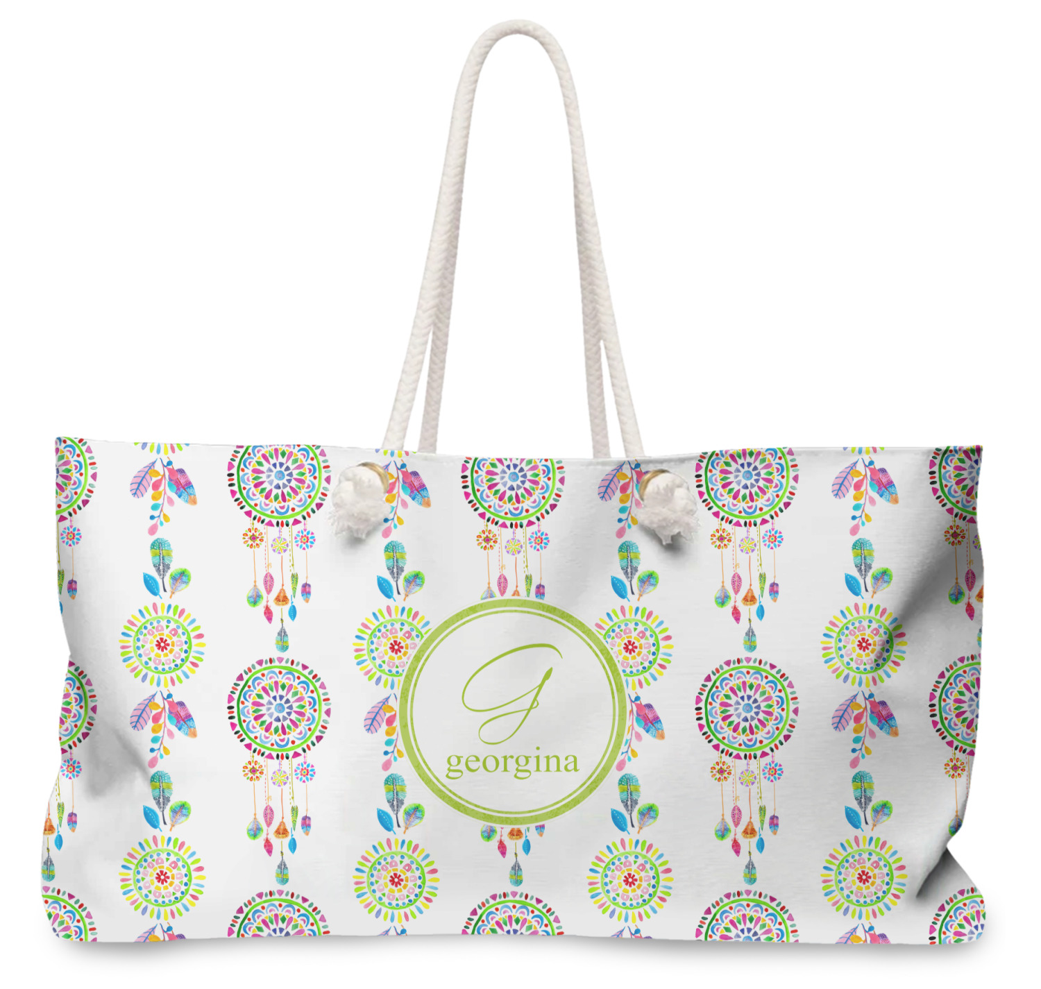 These large totes are handmade i.e. printed, cut and sewn right here in the USA. The canvas like material is printed using dye sublimation; the fabric is then cut and sewn along with a beautiful cream colored lining (to match the rope handles). The brass grommets are then added and the cream colored rope if fed through the grommets and knotted.