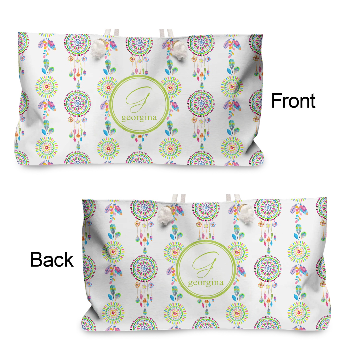 These weekender totes can be customized front and back. The totes are full all over print - so the choice of how background are endless - from beautiful floral or leaf patterns to geometrics or some classic Van Gogh artwork - the possibilities are endless. The totes can also be decorated with photos and logos.
