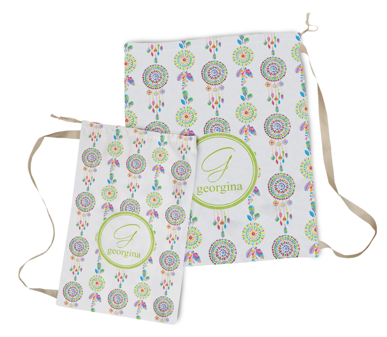 Carry your laundry in style with these customized laundry bags. Available in two sizes, featuring a natural colored woven strap and a cinch cord, these bags hold a lot of clothes or anything else you want to fit in them.