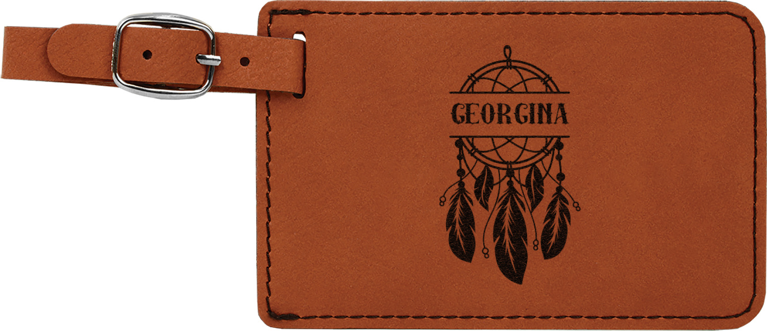 This luggage tag will surely be able to get you started in having all the right tools for traveling. It is made of a beautiful leatherette material that is a nice shade of cognac brown. The front of the tag is where your design goes. The sturdy black stitching gives your design an extra pop and gives the tag extra durability. The back of the tag has a clear vinyl window where you can slip in your address card. The tag comes with a great little buckle strap that you can easily use to clip to your suitcase. The tag itself measures at approximately 5.5"W x 4.25"H.