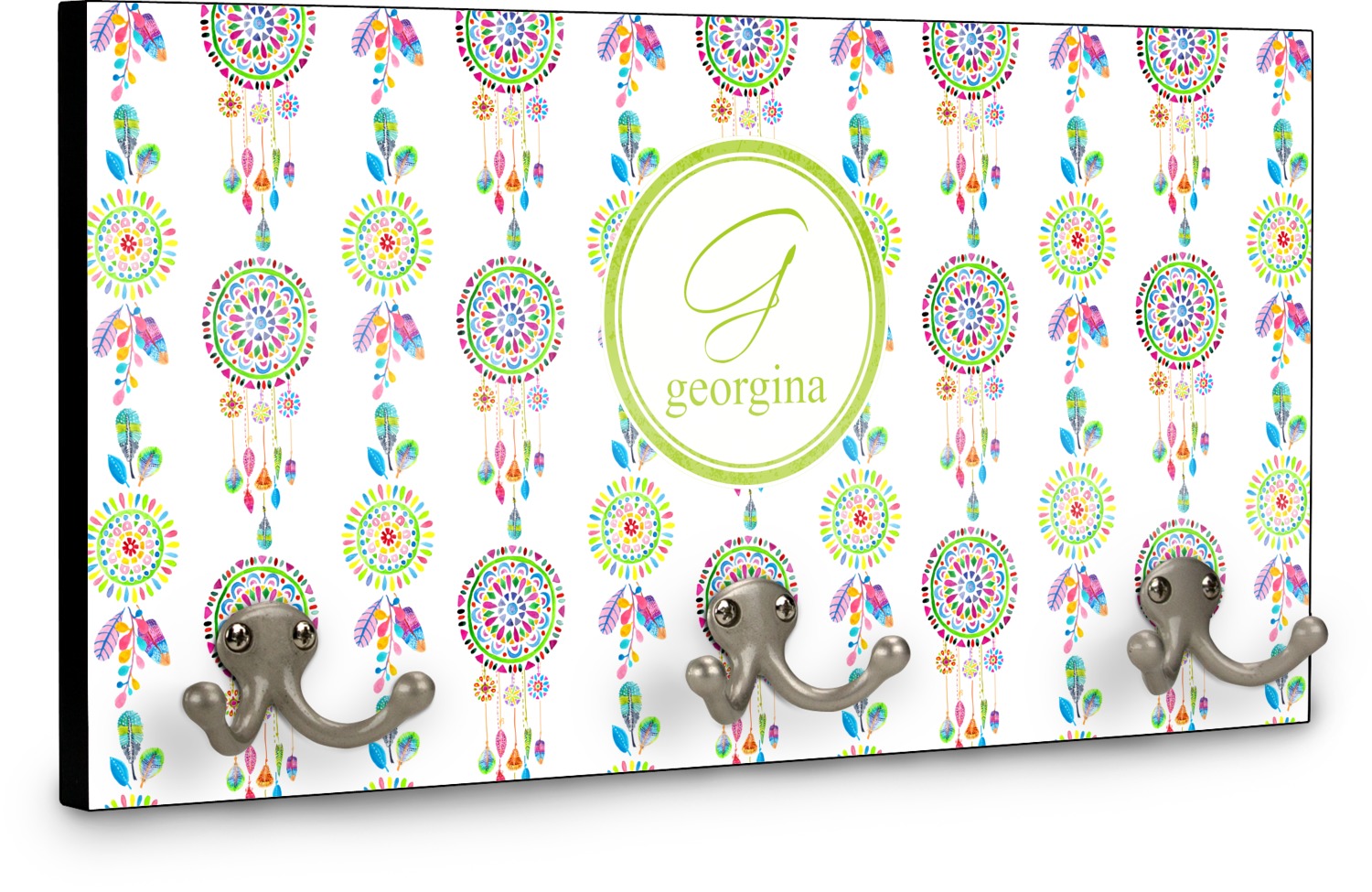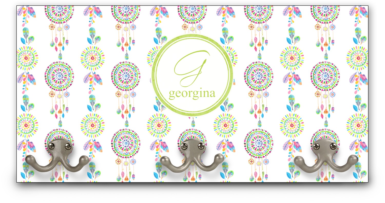 This coat rack is the perfect way to add some personality to your wall or entryway. The board is made of a strong maple that is approximately 16" x 8". The three 2-prong hooks are a sturdy metal that have three screws attaching them to the board. Your design is printed right onto the front of the board while the back and sides are a simple black.