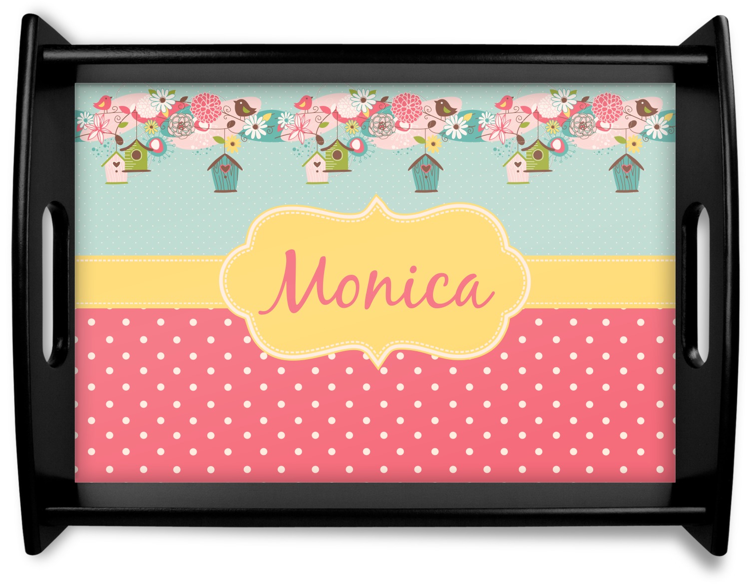 This serving tray with handles features square edges and two rounded sides, creating a very modern look. Each side is fabricated from a beautifully cut, natural wood. The bottom of the interior of the tray displays your customized design in bright, vibrant color. The tray is sold in both a black color and a natural wood look. Each variation of the wood serving tray has two sizes: Small, which is 14" x 10" x 2.25", and Large, which is 19.5" x 13.5" x 2.75".