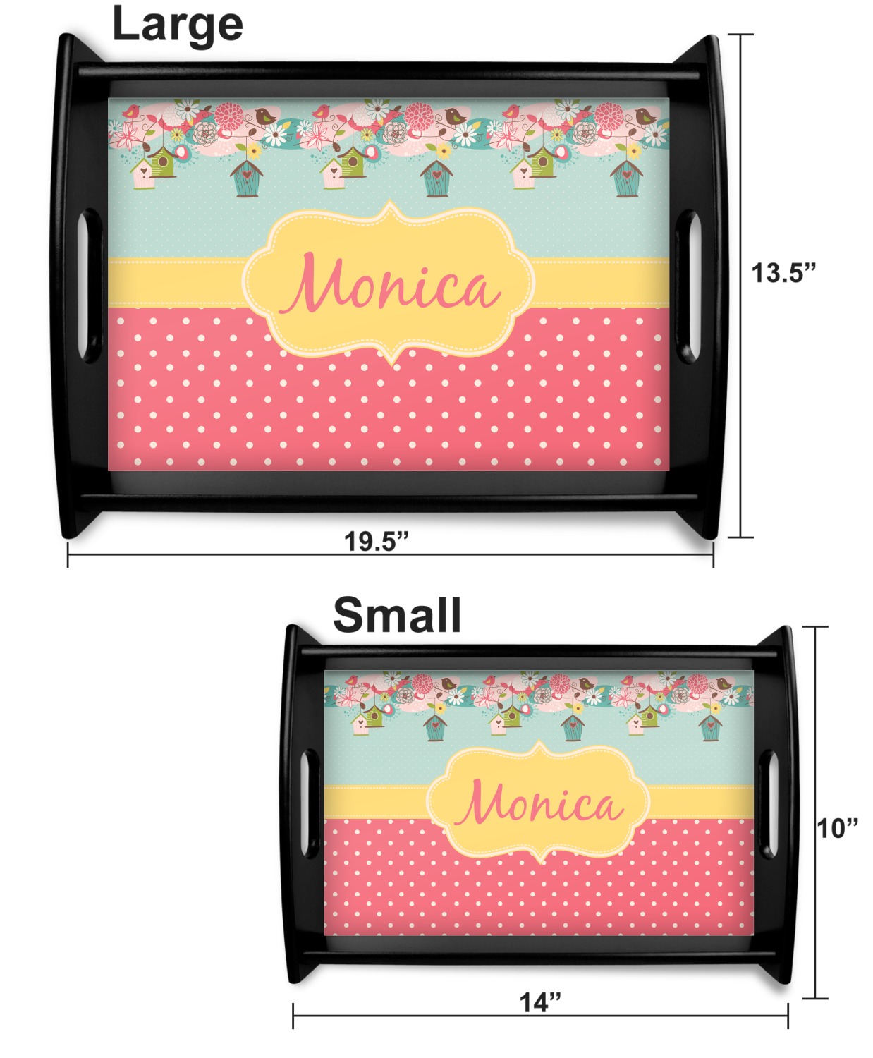 This serving tray with handles features square edges and two rounded sides, creating a very modern look. Each side is fabricated from a beautifully cut, natural wood. The bottom of the interior of the tray displays your customized design in bright, vibrant color. The tray is sold in both a black color and a natural wood look. Each variation of the wood serving tray has two sizes: Small, which is 14" x 10" x 2.25", and Large, which is 19.5" x 13.5" x 2.75".