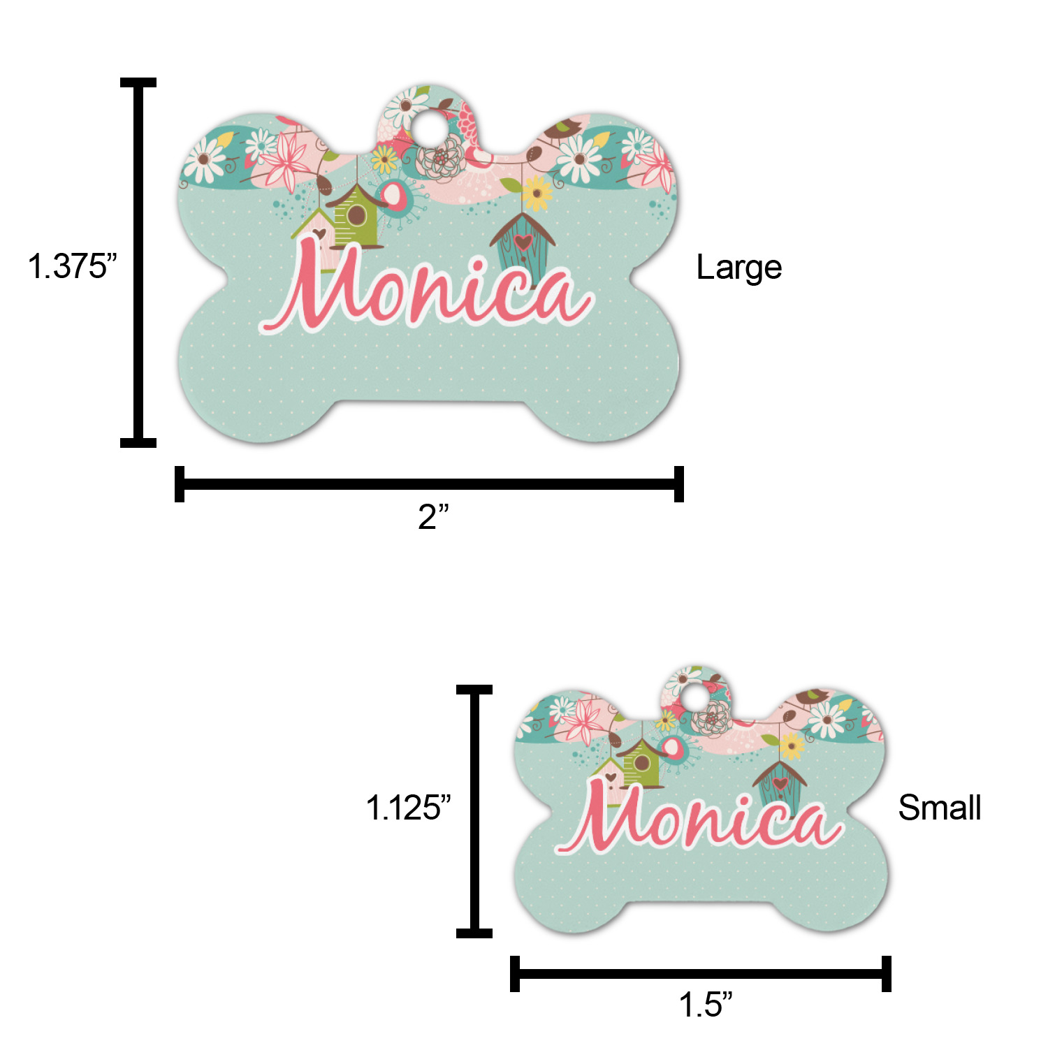 The small bone dog tag size is perfect to pair with our small dog collars, the large size pairs well with our large dog collars.