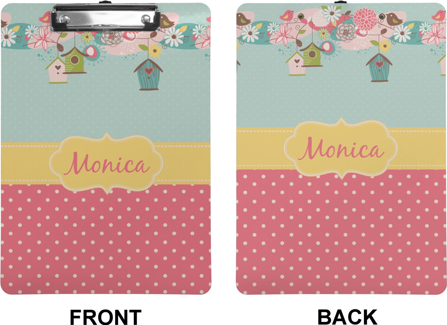 These custom clipboards are made from a strong hardboard and are coated with a glossy finish that accentuates the colors of your design. Alongside a retractable hook at its top, these decorative clipboards also feature sturdy clips to secure several sheets of paper. We sell these clipboards in two separate sizes. Our letter size measures at 12.5" L x 9" W, while our legal clipboard is approximately 15.5" L x 9" W. On both models, your personalization is printed on both sides of this clipboard and can be customized individually.