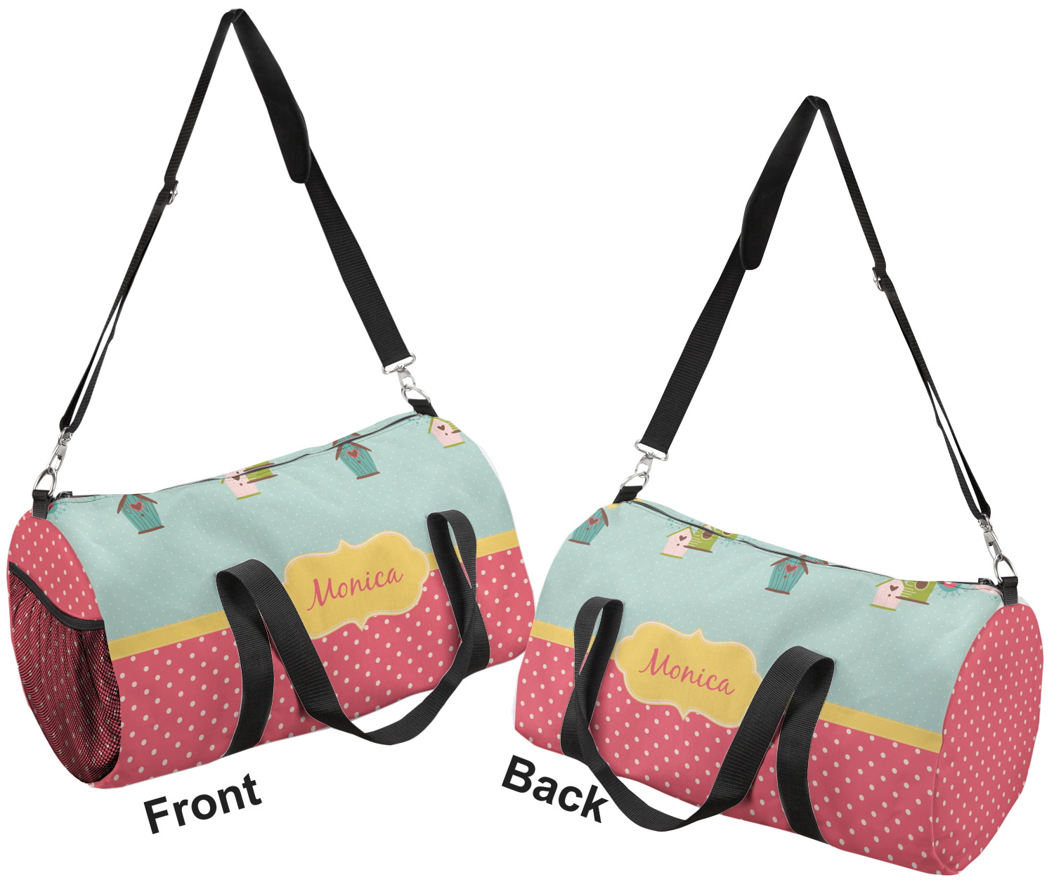 This duffle is a sturdy bag made of a canvas material. It comes in two sizes: Small (19"W x 9.5"H x 9.5"D) and Large (23"W x 12"H x 12"D). The bag is a cylindrical shape with a black adjustable strap and two handles. On one side is an elastic pouch to put a waterbottle or other small item. Your product will be sublimated with your design and is able to be designed on the front, back, and sides. Be sure to remember that the straps may cut into parts of your design if you upload your own artwork.
