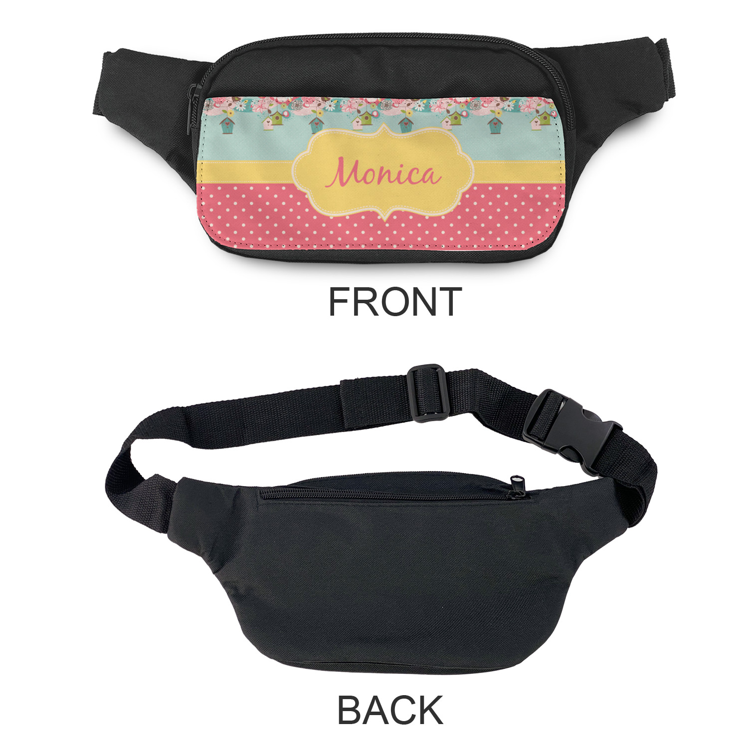 This is a unisex fanny pack - suitable for both men & women. The front flap is printed in full color with your design. You can add a photo, logo or any image that you would like. We offer a number of design templates that can be customized by you to your liking.