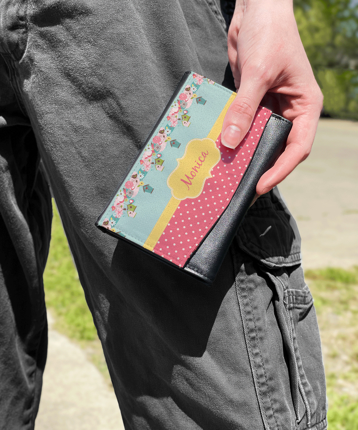 The compact size of this wallet - 5.5in wide, 3.5in tall and 0.75in thick when folded - makes it perfect to hold in hand and small enough to fit in a clutch or a normal size purse. The outside flap is customized with your choice of artwork and closes with a snap closure - with two different snaps to allow it to be adjusted when storing more items - to securely fasten the flap.