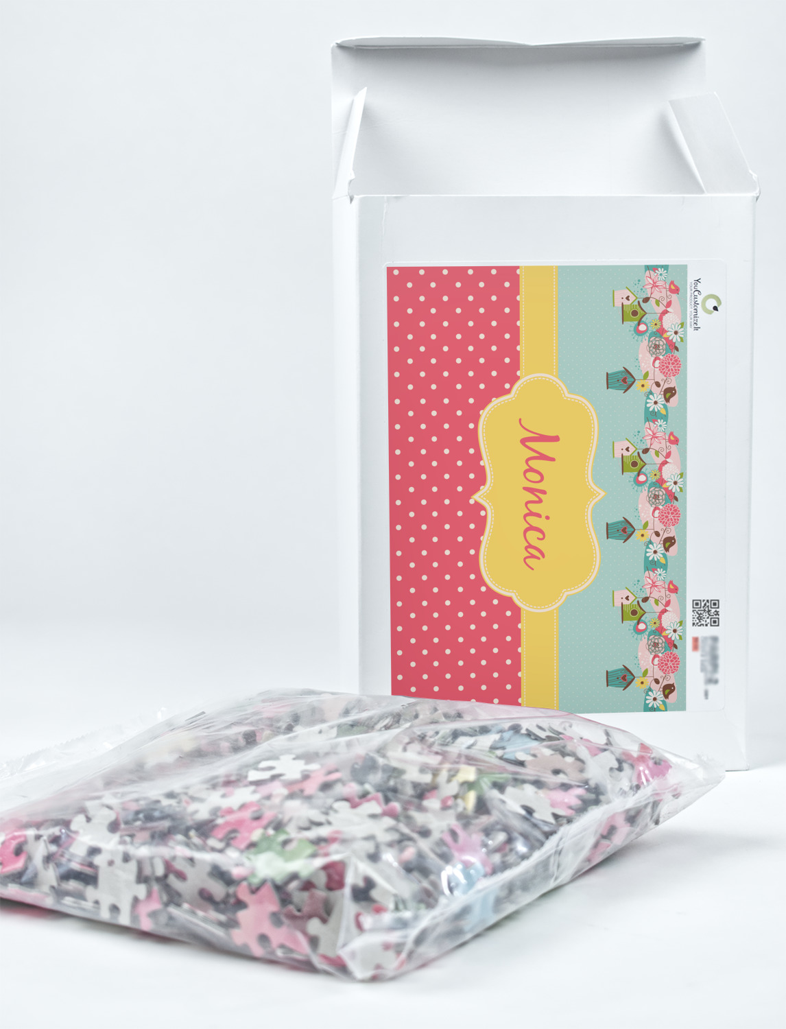 We print our puzzles on thick white chipboard in vibrant colors, then laminate the chipboard and die cut your puzzle. Your jigsaw puzzle is shipped to you in a box with the image of the puzzle on the box.