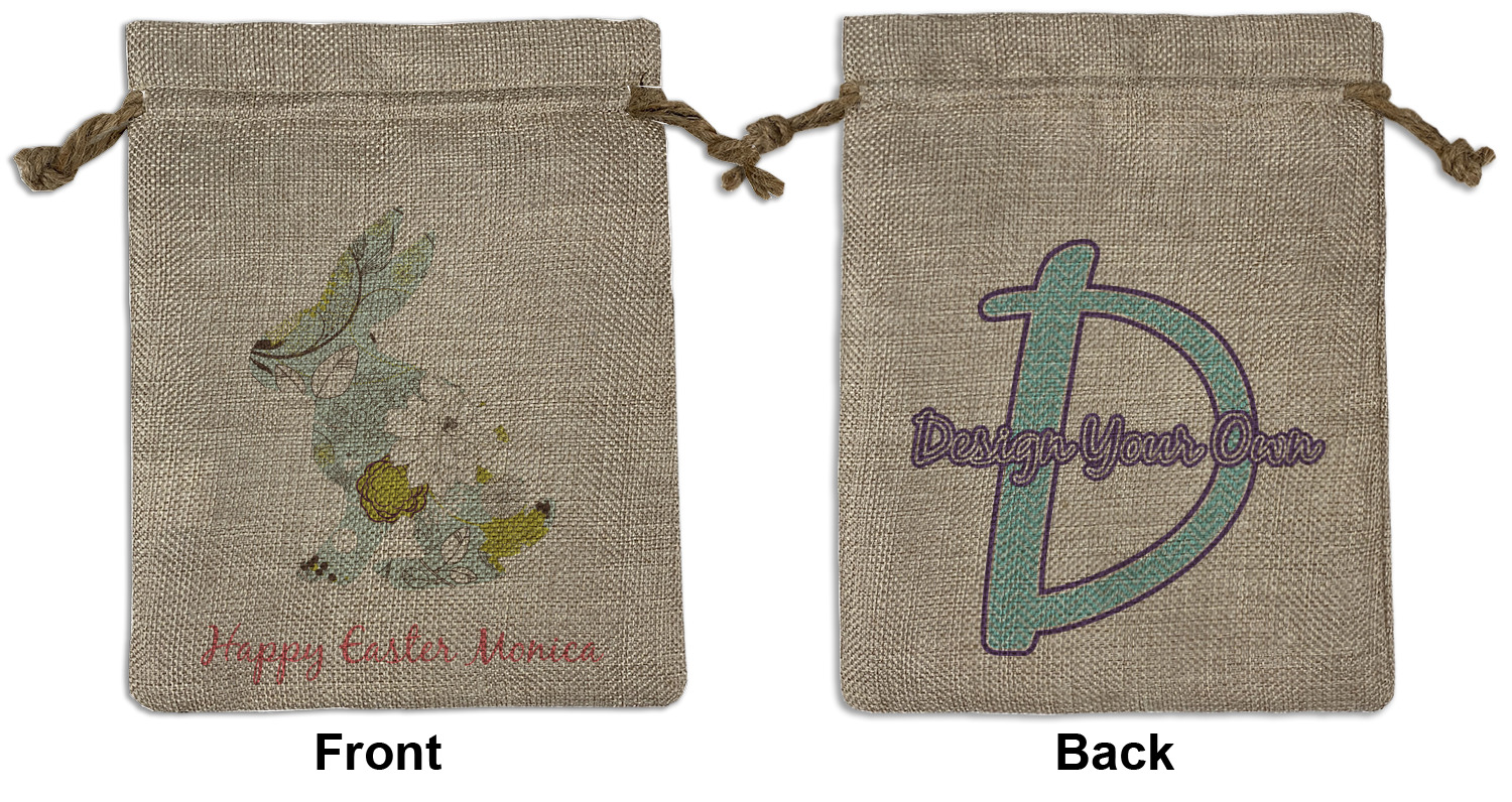 We sell our Burlap Gift Bags in 3 variant sized bags. Made with burlap polyester, each personalized bag can be secured with a twine drawstring pull. Your custom design is available to print on one side or both sides - completely up to you! The sizes of the bags measure approximately 4.5" x 6.5" for the smallest size, 6.5" x 8.0" for the medium size, and 6.5" x 13.5" for the large-sized bag.