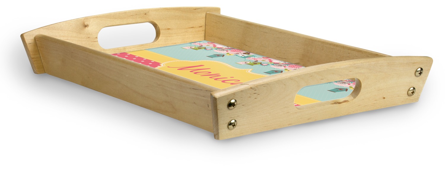 This serving tray with handles features square edges and two rounded sides, creating a very modern look. Each side is fabricated from a beautifully cut, natural wood. The bottom of the interior of the tray displays your customized design in bright, vibrant color. The tray is sold in both a black color and a natural wood look. Each variation of the wood serving tray has two sizes: Small, which is 14" x 10" x 2.25", and Large, which is 19.5" x 13.5" x 2.75".