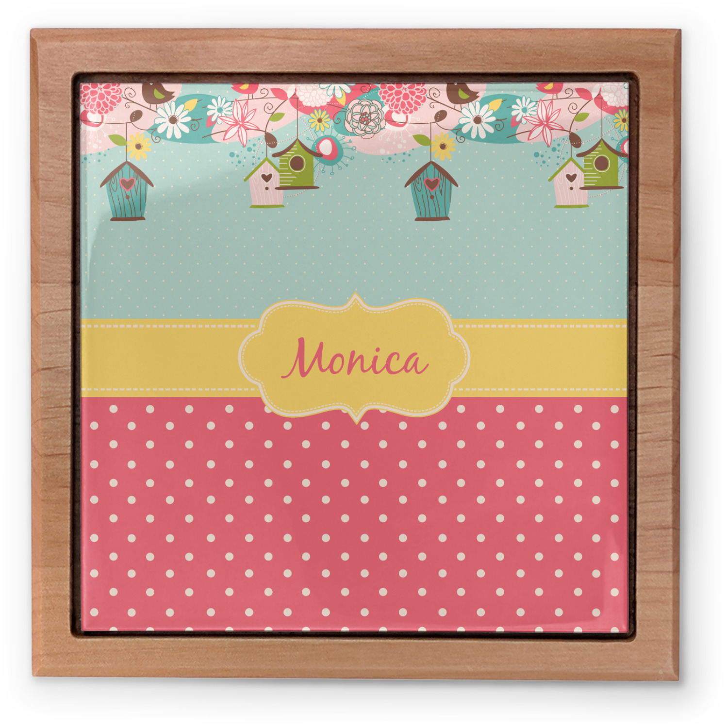 A perfect springtime pattern, whether specifically for Easter, or for just any lovely day. Complete with flowers, and the most adorable birdhouses, this pattern is sure to bring a smile to everyone's face. The design has a classic yellow ribbon, with a decorative label. Add your name for that personal touch to pull the entire design together.