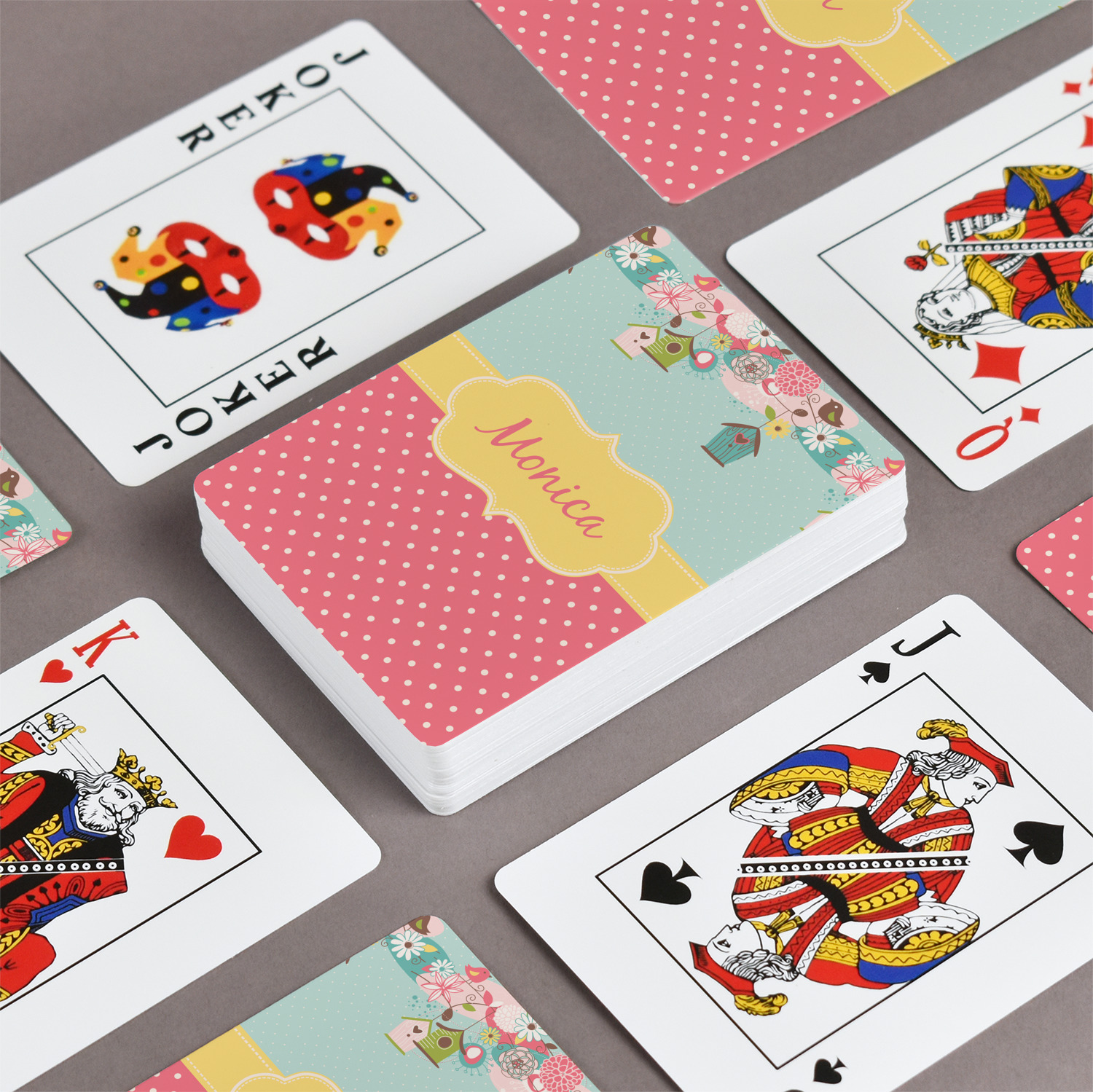 The customization / personalization is printed on the back side. The playing cards have a low gloss coating on both sides. The cards are packaged in a clear plastic box.