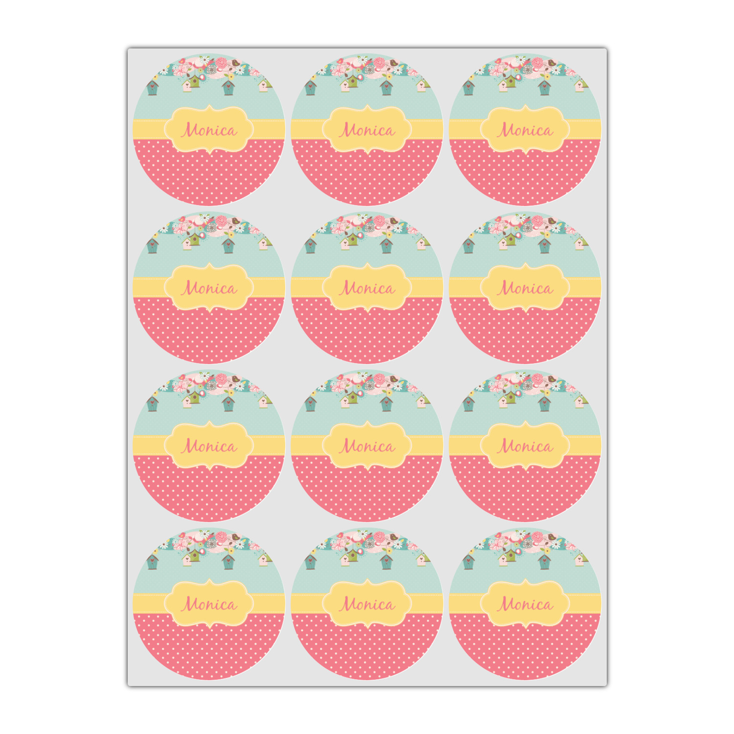 A perfect springtime pattern, whether specifically for Easter, or for just any lovely day. Complete with flowers, and the most adorable birdhouses, this pattern is sure to bring a smile to everyone's face. The design has a classic yellow ribbon, with a decorative label. Add your name for that personal touch to pull the entire design together.