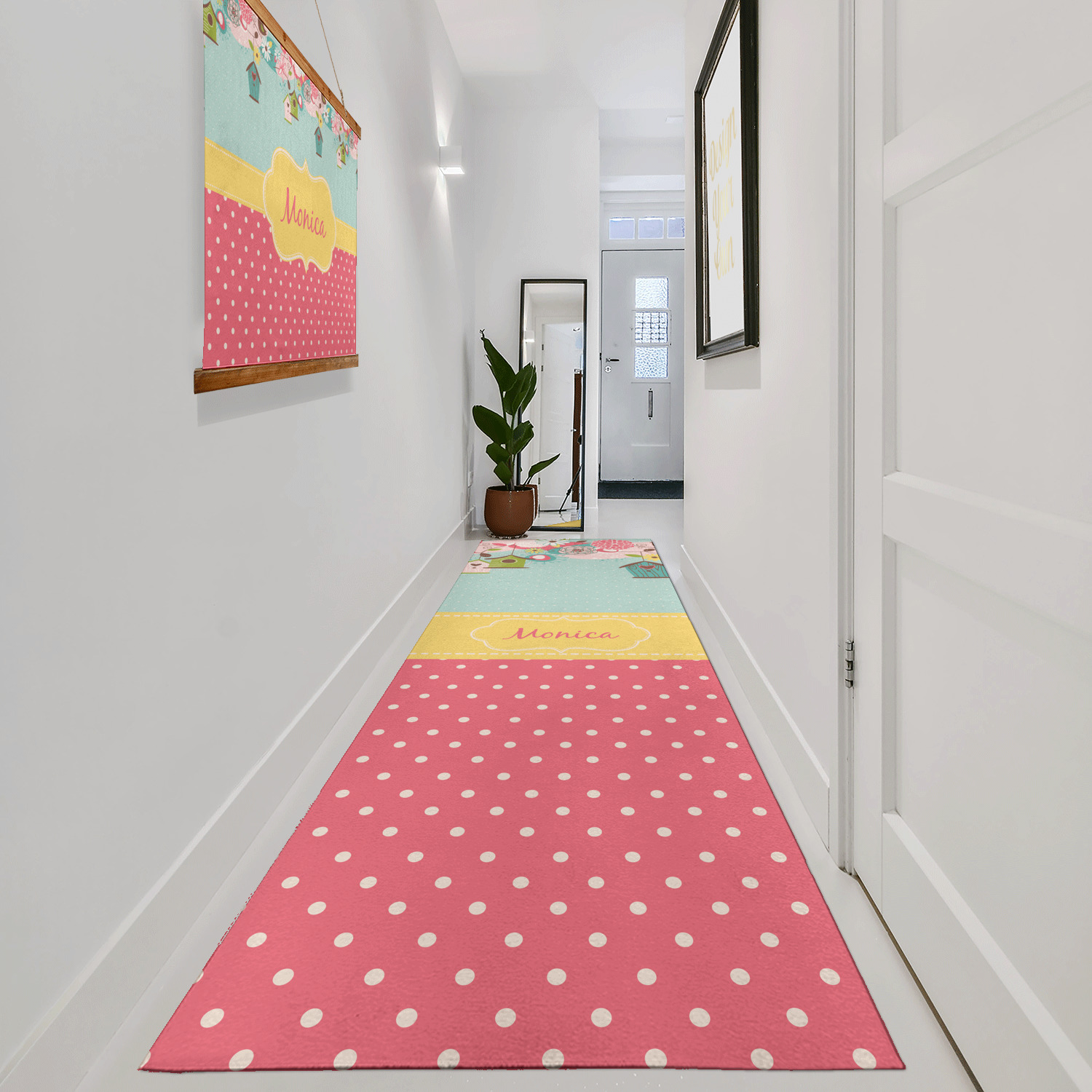 Our custom runner rugs and area rugsare both velvety soft and smooth, with a short pile, beautiful sewn corners and edges on the poly chenille face. We recommend adding an anti-slip mat under your runner rug to prevent it from sliding when under foot when placed on hard or smooth surfaces.