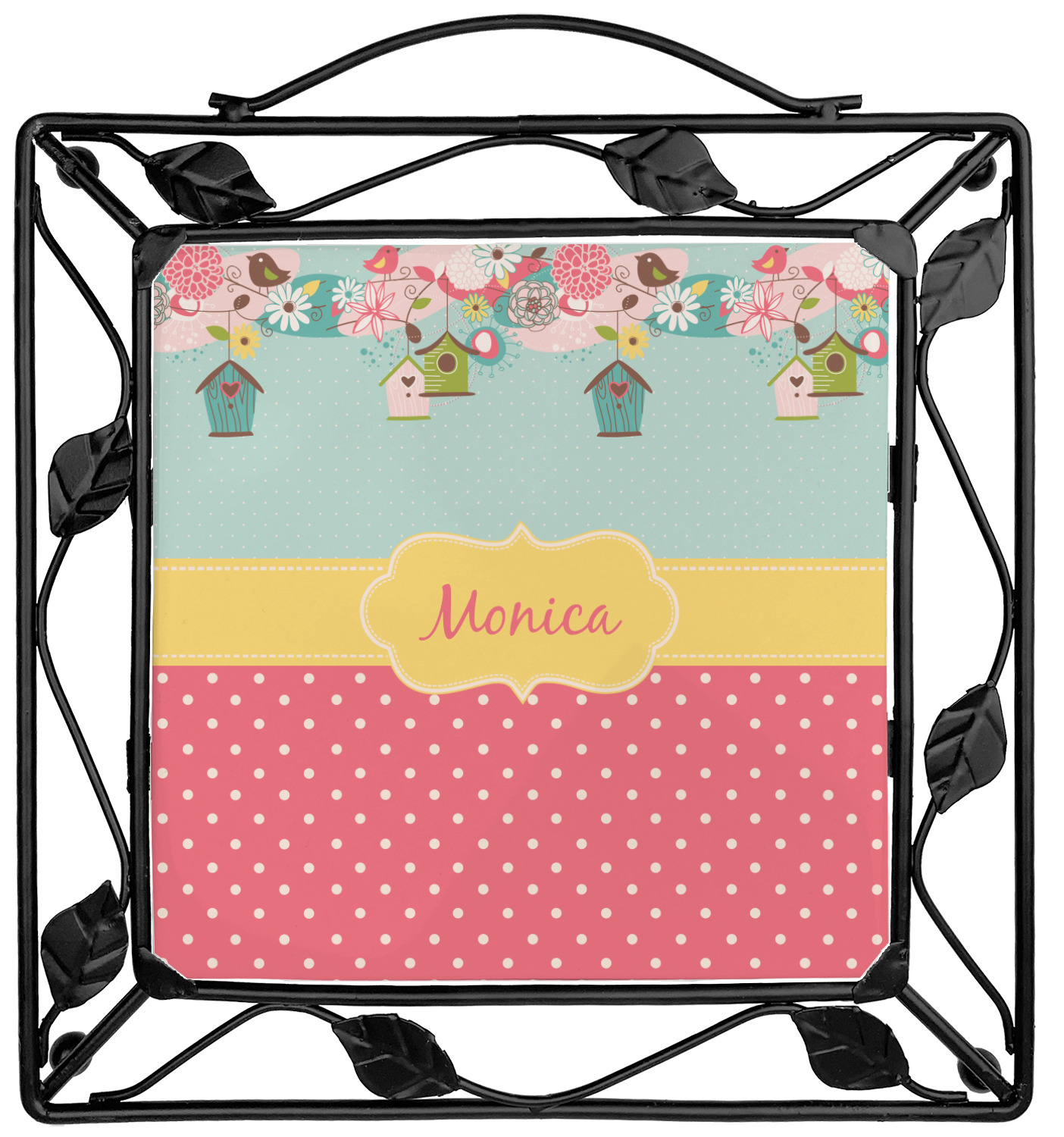 Our square trivets are made from a durable, wrought iron. This model features 4 small half circles, one on each corner, and a larger ring of iron that circles the central, customized tile. Each of the 4 corners has a round foot on its bottom for stability. This trivet is 8.75 by 8.75 inches, but the central tile measures at 6 inches on both sides.