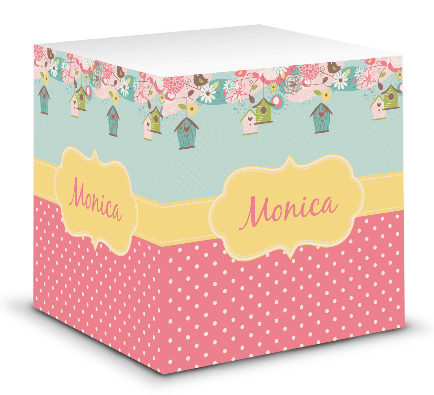 This note cube features 700 sheets of matte, white paper. Each sheet measures at 3.5 by 3.5 inches and has an adhesive strip at its top. Your personalized design is displayed on all four edges of the sticky pad.