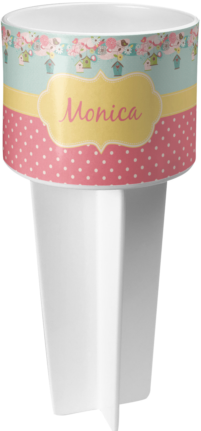 This cup holder has a large stake at its bottom that anchors it to the sand or ground below, while the cup holder rests above the stake. The entire drink holder is made of durable plastic and displays your customization around the cup holder portion. We sell these personalized beach spikers in two different colors: black and white.