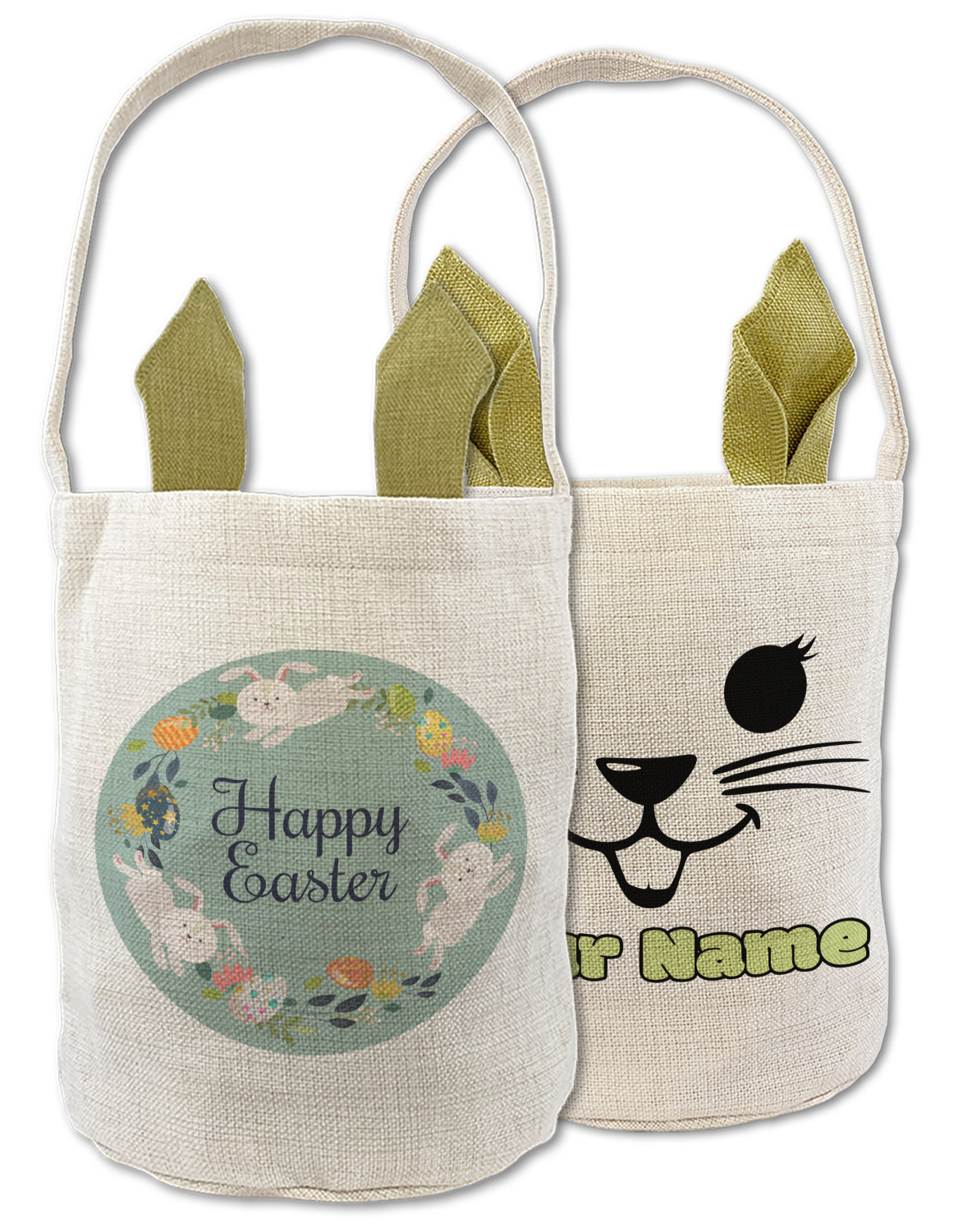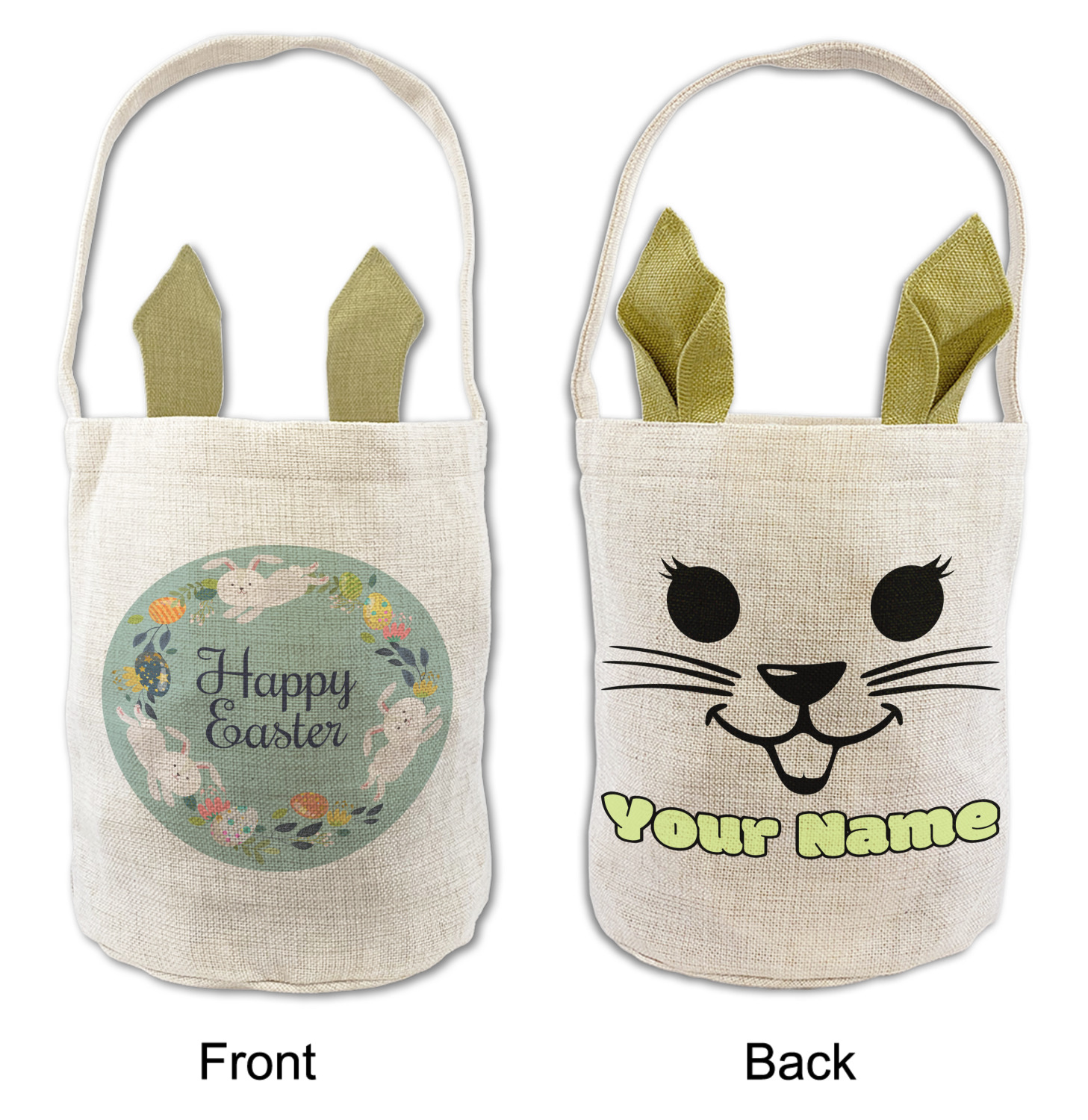 Our baskets comes with two cute bunny ears and customizable bunny faces with your name easily added to the design. You also have the option of adding another image or photo to the other side of the basket for even more color and design options.