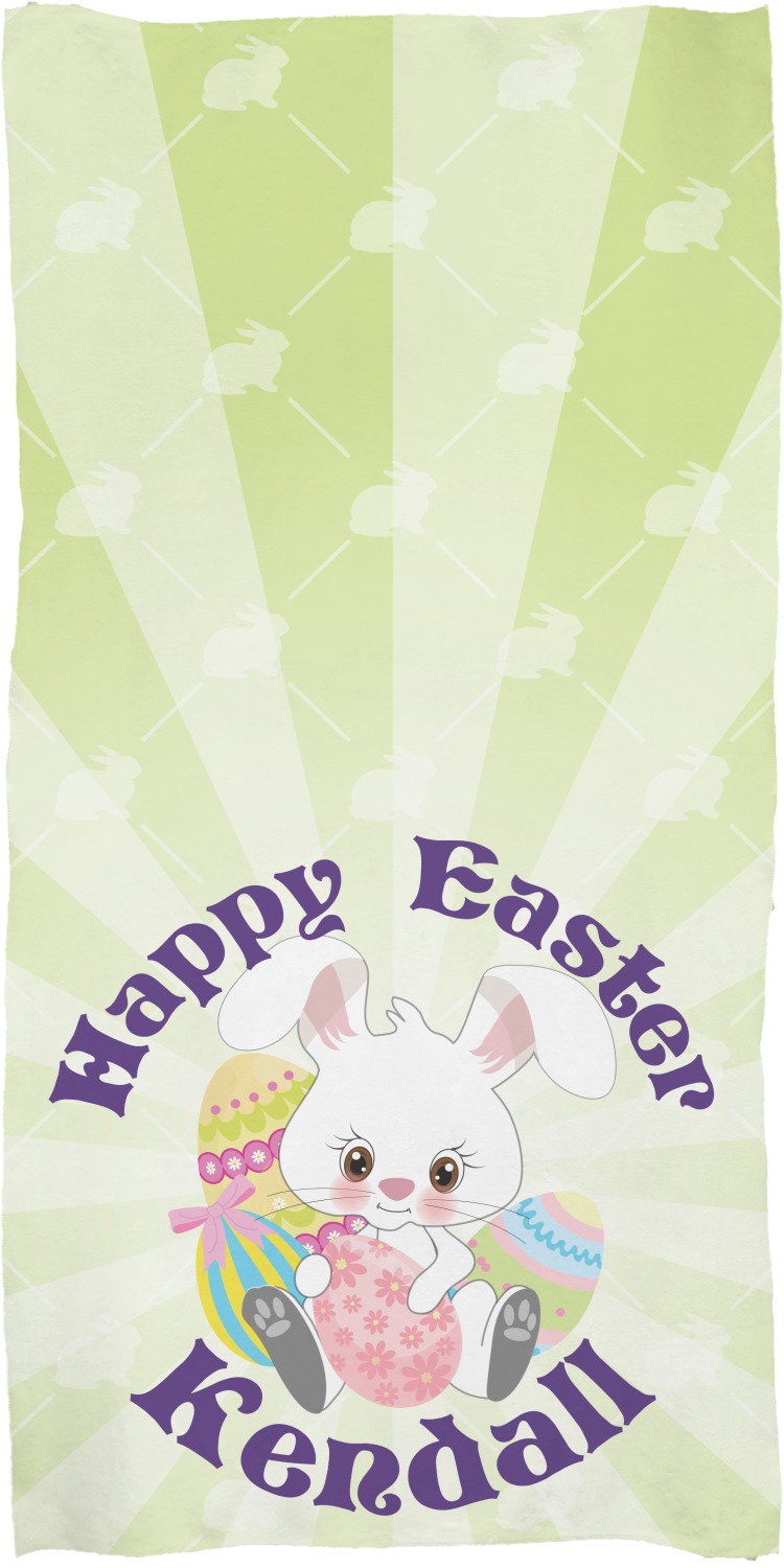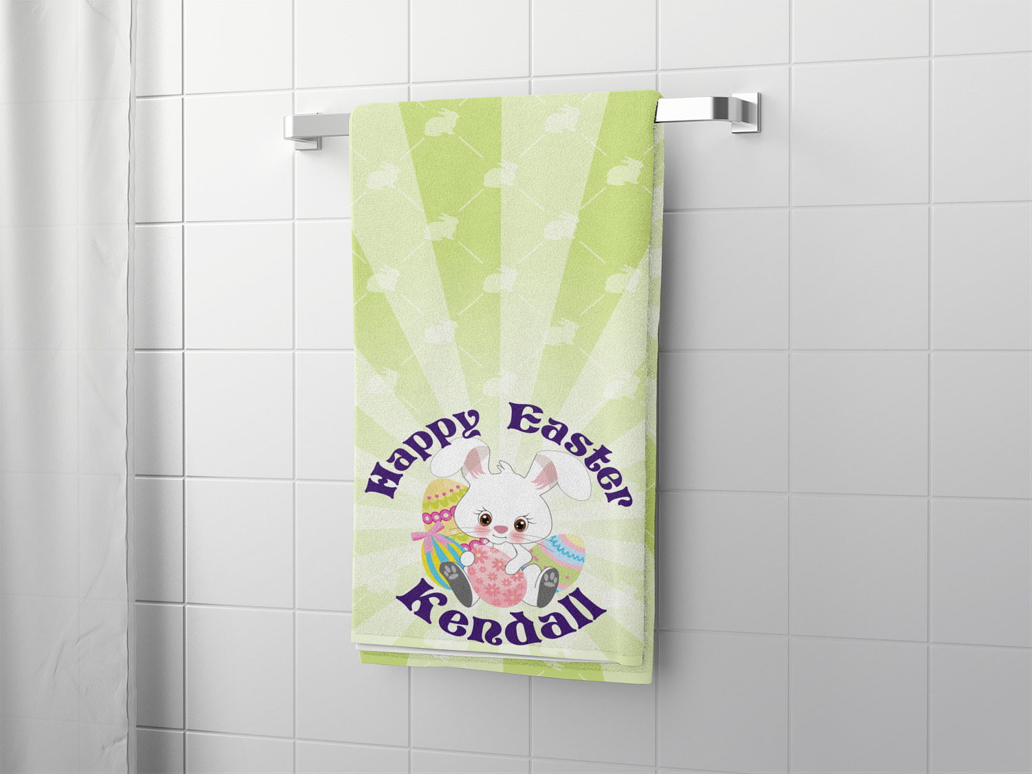These customized bath towels are slightly larger than your standard towel and are the ideal size for wrapping around your body. They measure approximately 60" x 30". Your customization is displayed across the entire front face of the towel, while the back is white.
