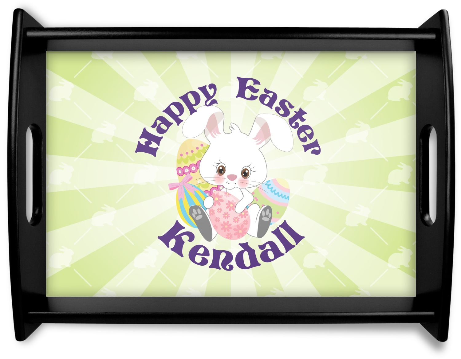 This Easter Bunny design is the prefect example of layered design to create a gorgeous look. We started with a simple Easter bunnies pattern and made it tone on tone. Then we layered it with a our starburst design to create that heroic look. We then used our adorable Easter Bunny with eggs as our hero. We topped off the design with our newest curved text above and below the Easter Bunny.
