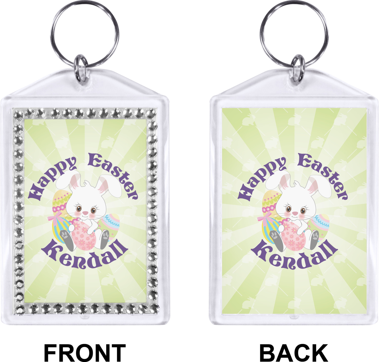 Our personalized keychains have a bold, rectangular shape, outlined by a series of shimmering rhinestones. A metal, split keyring is included with your purchase, and an additional metal hoop allows for attachment of the keychain to the split ring. This unique keychain measures at about 3.75 by 2.5 inches. We print your customized design(s) across both the back and front of this keychain.
