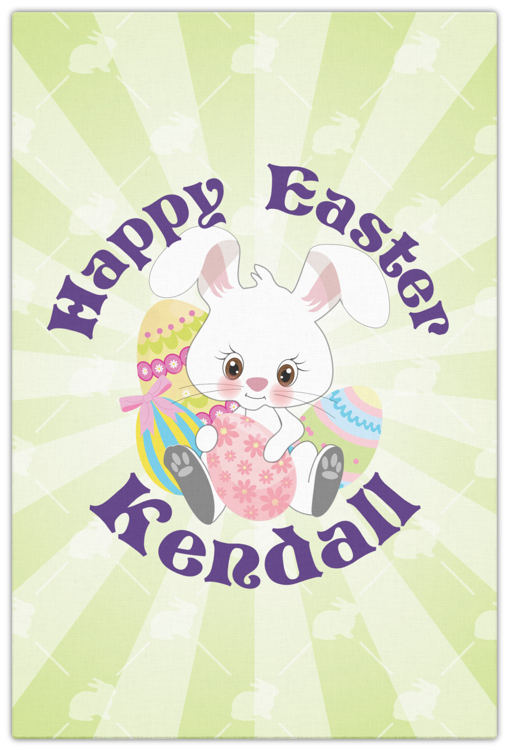 This Easter Bunny design is the prefect example of layered design to create a gorgeous look. We started with a simple Easter bunnies pattern and made it tone on tone. Then we layered it with a our starburst design to create that heroic look. We then used our adorable Easter Bunny with eggs as our hero. We topped off the design with our newest curved text above and below the Easter Bunny.