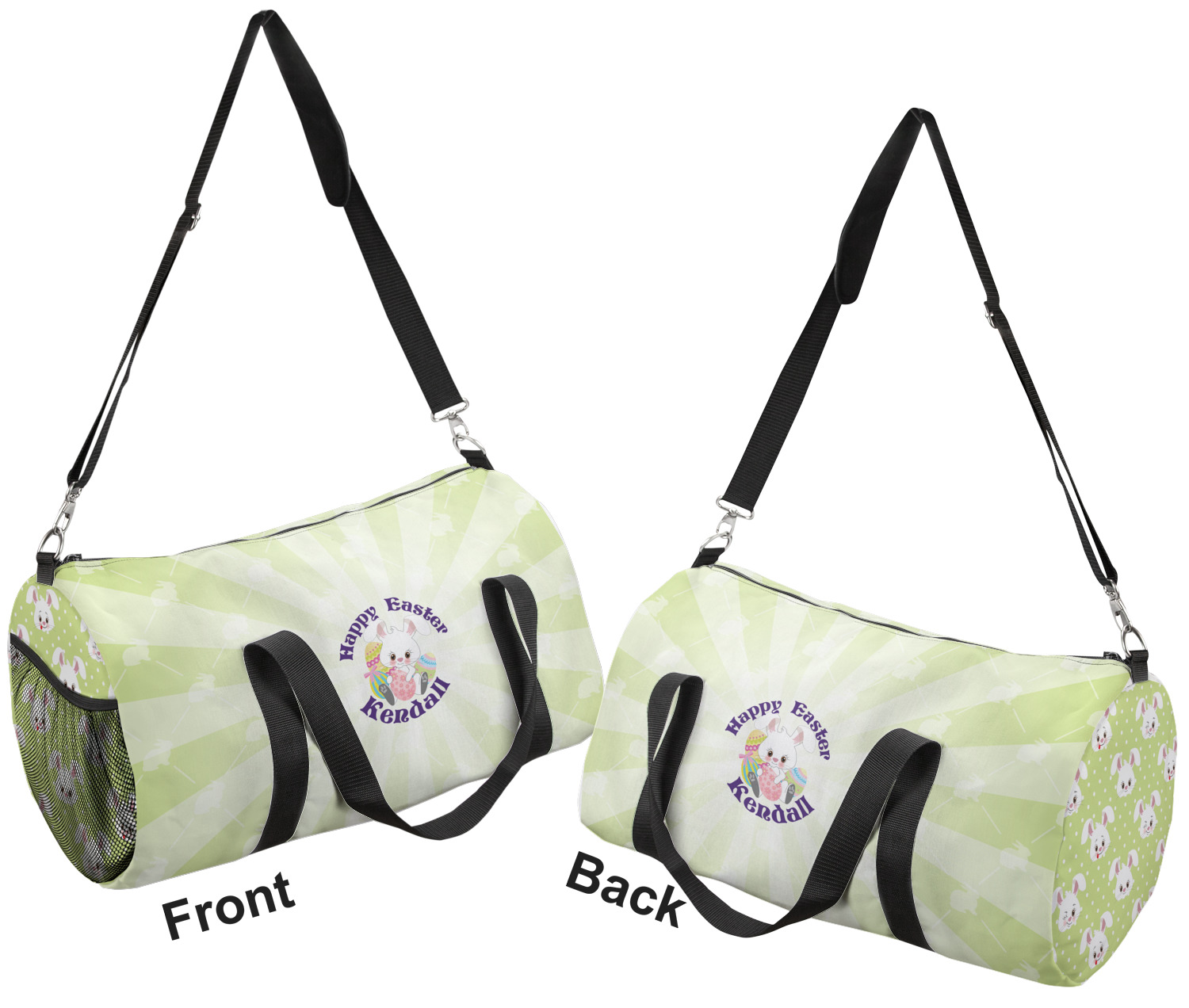 This duffle is a sturdy bag made of a canvas material. It comes in two sizes: Small (19"W x 9.5"H x 9.5"D) and Large (23"W x 12"H x 12"D). The bag is a cylindrical shape with a black adjustable strap and two handles. On one side is an elastic pouch to put a waterbottle or other small item. Your product will be sublimated with your design and is able to be designed on the front, back, and sides. Be sure to remember that the straps may cut into parts of your design if you upload your own artwork.