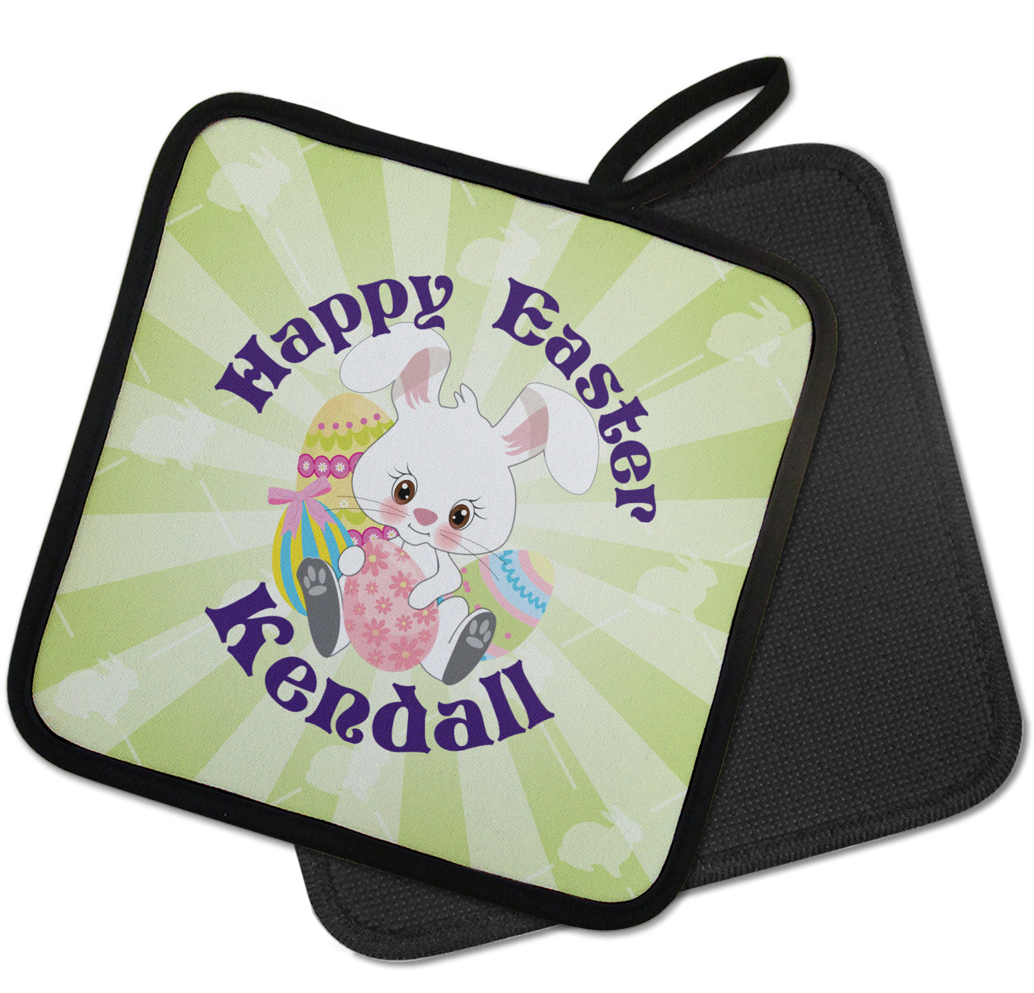 Our personalized pot holders feature a neoprene front that displays your personalization in vibrant colors. The backing of the hot pot holder is rubberized; the textured backing allows you to have a great grip when using this custom pot holder. The two materials are joined with a sleek, black trim, and the holder also includes an attached loop for hanging and storage. The pot holder is approximately 8.75 inches by 8.75 inches and 0.25 inches tall, while the fabric loop is 2.5 inches long. You can purchase a kitchen pot holder by itself or as a set of 2. We also offer a set including one pot holder and one oven mitt.