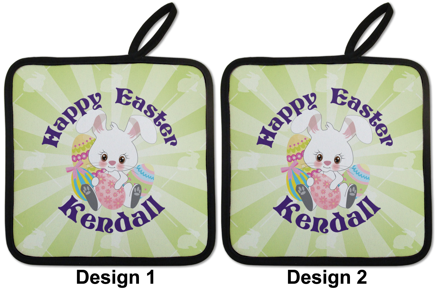 Our personalized pot holders feature a neoprene front that displays your personalization in vibrant colors. The backing of the hot pot holder is rubberized; the textured backing allows you to have a great grip when using this custom pot holder. The two materials are joined with a sleek, black trim, and the holder also includes an attached loop for hanging and storage. The pot holder is approximately 8.75 inches by 8.75 inches and 0.25 inches tall, while the fabric loop is 2.5 inches long. You can purchase a kitchen pot holder by itself or as a set of 2. We also offer a set including one pot holder and one oven mitt.