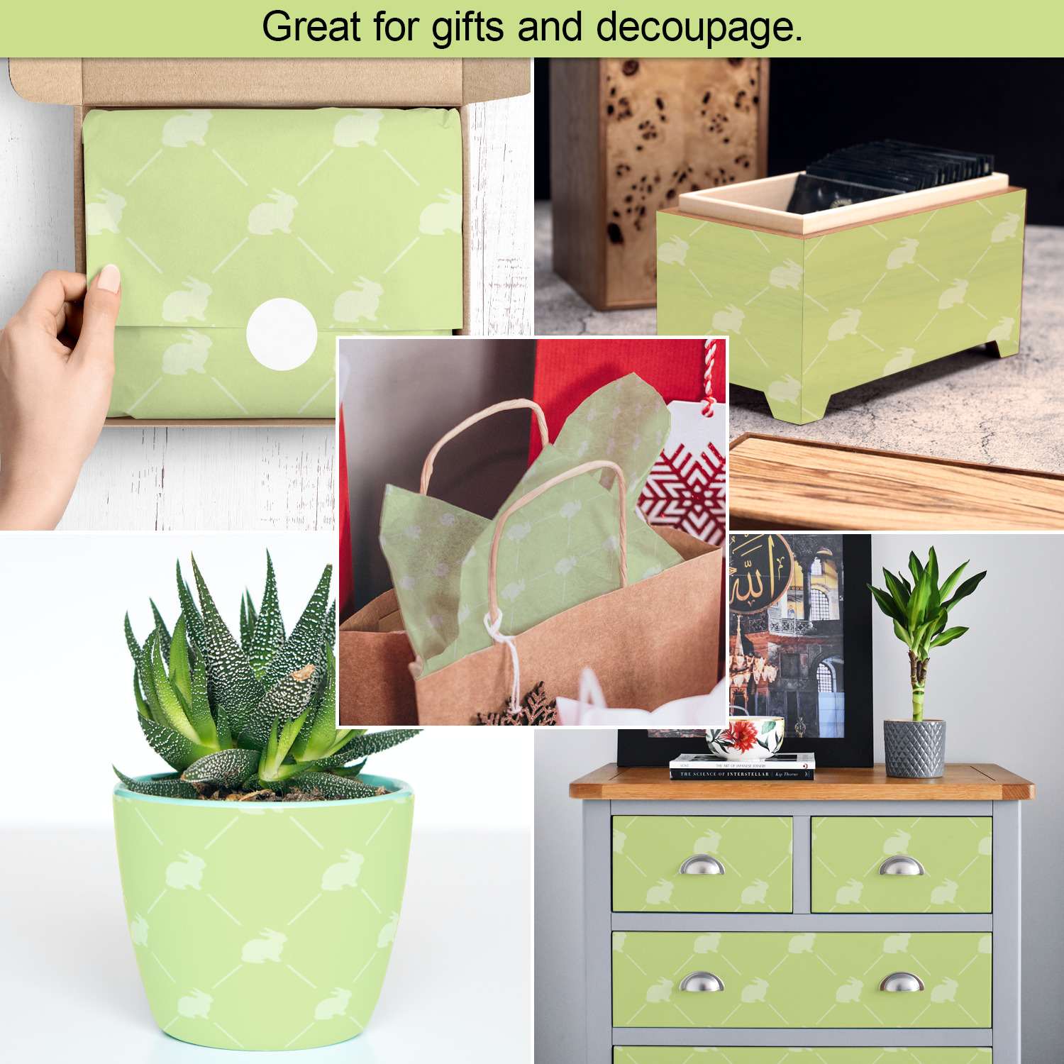Our tissue paper sheets are also perfect for decoupage i.e. the art of gluing paper on ordinary objects to decorate them.